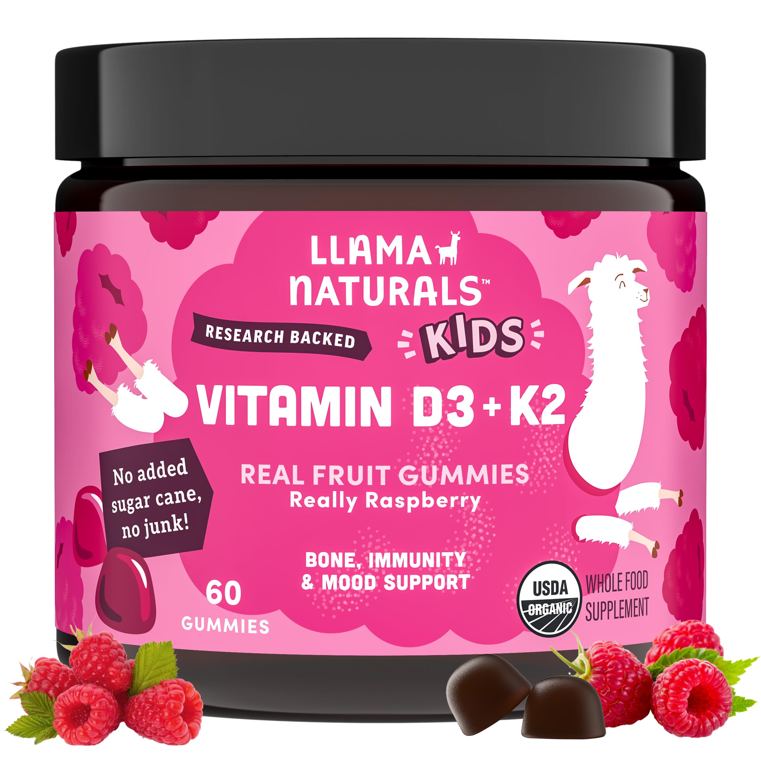Finally, a Vitamin D Gummy Made of Fruit, Not Candy. Support your child's growing bones and immune system with the cleanest vitamin d3 k2 gummies for kids on the market. While other brands rely on sugar cane and synthetic sprays, Llama Naturals relies on nature. Real Fruit, No Added Sugar Cane: We use organic fruit, gently cooked to create a soft, chewy texture. No syrups, no gelatin, and absolutely no synthetic vitamins. Stronger Bones Teeth: Includes Vegan D3 to help absorb calcium and Vitamin K2 (MK-7) to direct that calcium to the bones. Picky Eater Approved: A delicious, natural strawberry flavor that kids love, with no artificial sweeteners or waxes. Plant-Based Nutrition: 100 Vegan. Our D3 comes from Lichen (not sheep's wool lanolin) and our K2 comes from chickpeas. Ingredients: Organic Fruit Blend, Vitamin D3 (from Lichen), Vitamin K2 (MK-7 from Chickpea). Suggested Use: 1 gummy daily for ages 2–3 2 gummies daily for ages 4 .TODDLER KID FRIENDLY DOSING: Formulated for growing bodies ages 2 . One gummy for toddlers (2–3) and two gummies for kids (4 ). Easy to chew, easy to remember, and easy to fit into your family's daily routine. . MAX ABSORPTION, PLANT-BASED SOURCE: Most gummies use cheap synthetic D2 or D3 from sheep's wool (lanolin). We use premium, bioavailable D3 from wild-harvested lichen and K2 (MK-7) from chickpeas for superior absorption that is 100 vegan and vegetarian friendly. . YEAR-ROUND IMMUNE DEFENSE: Sunshine in a gummy. Vitamin D3 is essential for activating immune defenses, making this a daily essential for school days, travel, and winter months when the sun is scarce. . PICKY EATER APPROVED TASTE: The daily fight is over. These are soft, fruity gummies that picky eaters actually want to take. Parents love the short, transparent ingredient list, and kids love the real raspberry flavor—making it easy to build a healthy habit. . D3 K2 - "PERFECT PAIR" FOR BONES: Calcium needs a guide. Our Vitamin D3 (from Vegan Lichen) helps kids absorb calcium, while Vitamin K2 (from Chickpeas) directs that calcium into bones and teeth where it belongs. This dynamic duo ensures growing bones get the support they need. . REAL FRUIT GUMMIES, NO ADDED SUGAR CANE: Finally, vitamin d3 k2 gummies for kids made from real organic fruit, not sugar cane or syrups. We use gently cooked fruit to create a soft texture kids love, with zero synthetic vitamins, gelatin, pectin, or artificial junk. Just clean, plant-based nutrition.