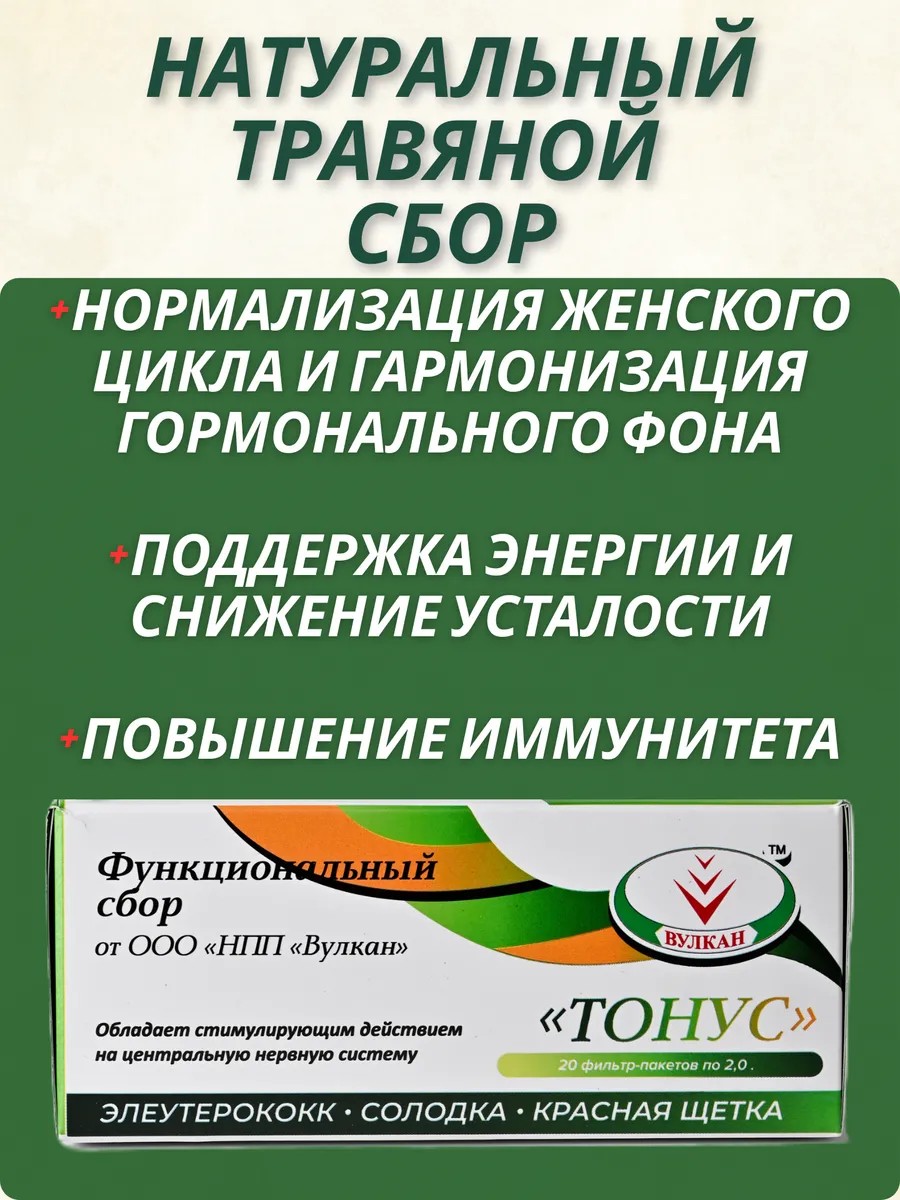 Функциональный фитосбор «Тонус» от ООО «НПП Вулкан» — натуральный травяной сбор в фильтр-пакетах для заваривания, предназначенный для поддержания и повышения жизненного тонуса и энергии.