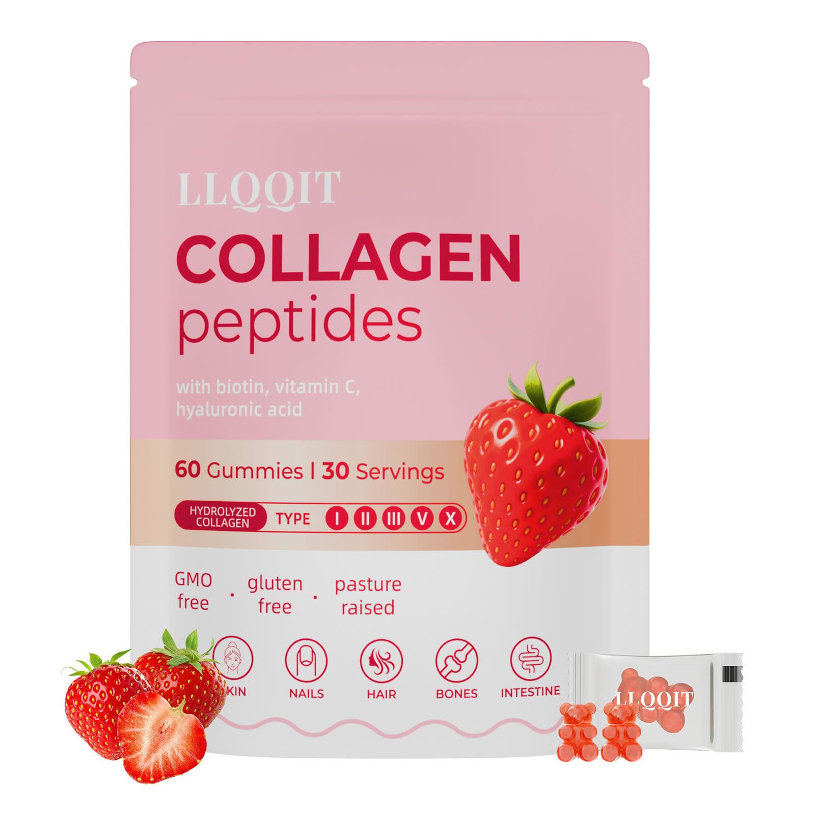 LLQQIT 60 Count Multi-Collagen Peptides Gummies for Women - Packed with Types I II III V X Vitamins C E Zinc & Hyaluronic Acid - Non-GMO & Gluten Free