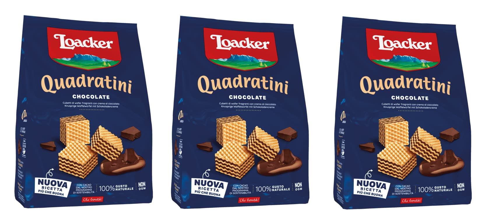 Four layers of chocolate cream are held together by five crispy wafers. The delicious chocolate cream, refined with premium Ecuadorian cocoa, guarantees unlimited chocolate pleasure. The delicious cocoa from our sustainable Cocoa Farming Program gives these crispy cubes a special aroma and promises a unique experience. Crispy ice cubes filled with chocolate cream (74 ). Ingredients: wheat flour, coconut oil, glucose syrup, whey powder (milk), sugar, low-fat cocoa, soy flour, chocolate (sugar, cocoa mass) 5 in the whipped cream filling, skimmed milk, skimmed milk powder (sodium carbonate, disodium diphosphate), nut), emulsifier, soy lecithin, salt, barley malt extract, apple juice concentrate, spices, bourbon vanilla pods. May contain peanuts and almonds. Nutritional values per 100g: Energy 2126 kJ 509 kcal - Fat 27g of which: saturates 22g - Carbohydrate 56g of which sugars 26g - Protein 8.8g - Salt 0.38g. INGREDIENTS Wheat flour, coconut oil, glucose syrup, whey powder (milk), sugar, low-fat cocoa, soy flour, chocolate (sugar, cocoa mass) 5 in the whipped cream filling, skimmed milk, skimmed milk powder (sodium carbonate, disodium diphosphate), hazelnut, emulsifier, soy lecithin, salt, orange, malt extract, apple juice concentrate, spices, bourbon vanilla pods. May contain peanuts and almonds.Loacker Quadratini Lot de 3 cubes Chocolate Chocolat 125 gDESCRIPTION DU PRODUIT DESCRIPTION DU PRODUIT Quatre couches de crème au chocolat sont maintenues par cinq gaufres croustillantes. La délicieuse crème au chocolat raffinée avec du cacao noble de l'Équateur garantit un plaisir de chocolat illimité. Le délicieux cacao issu de notre programme de développement durable « Cocoa Farming Program » donne à ces cubes croustillants un bouquet spécial et promet un plaisir unique. Glaçons croustillants garnis de crème au chocolat (74 ). Ingrédients : farine de blé, huile de coco, sirop de glucose, poudre de lactosérum (lait), sucre, cacao faible en graisse, farine de soja, chocolat (sucre, pâte de cacao) 5 dans le remplissage de chantilly, lait écrémé, poudre de lait écrémé (carbonate de sodium, diphosphate de disodium), noise), émulsifiant, lécithine de soja, sel, Malt d'orge Extrait, concentré de jus de pomme, épices, gousses de vanille bourbon. Peut contenir des cacahuètes et des amandes. Valeurs nutritionnelles pour 100 g : Energy 2126 kJ 509 kcal - Matières grasses 27 g dont : acides gras saturés 22 g - Hydrate de carbone 56 g dont sucre 26 g - Protéine 8,8 g de sel 0,38 g. INGRÉDIENTS farine de blé, huile de coco, sirop de glucose, poudre de lactosérum (lait), sucre, cacao faible en graisse, farine de soja, chocolat (sucre, pâte de cacao) 5 dans le remplissage de chantilly, lait écrémé, poudre de lait écrémé (carbonate de sodium, diphosphate de disodium), noise), émulsifiant, lécithine de soja, sel, orange. Extrait de malt Concentré de jus de pomme, épices, gousses de vanille bourbon. Peut contenir des cacahuètes et des amandes.