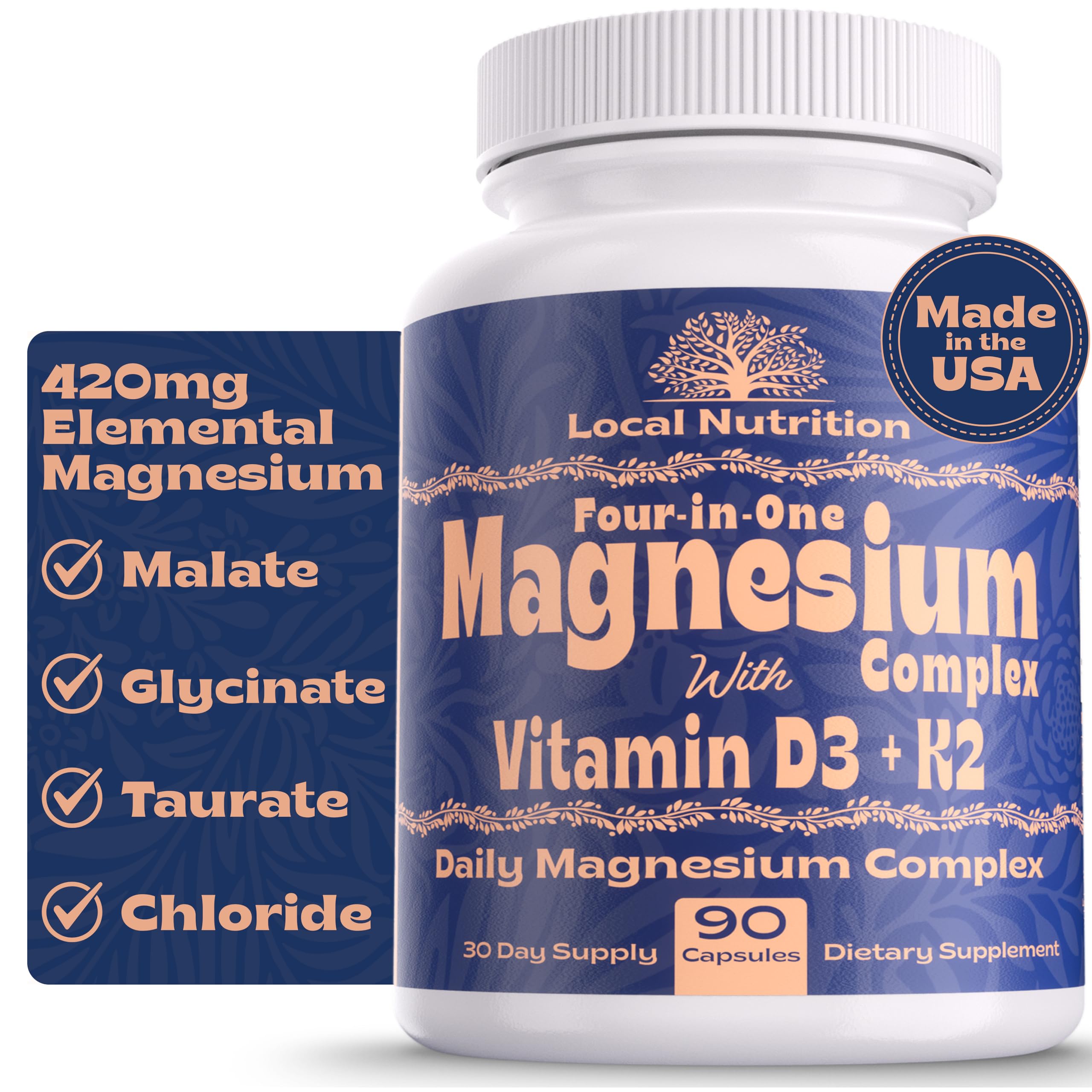 Local Nutrition Magnesium Complex 420mg with Vitamin D3 K2 - Four Bioavailable Forms Including Bisglycinate (Glycinate) Malate Taurate and Chloride for Superior Absorption - 90 Capsules Made in USA