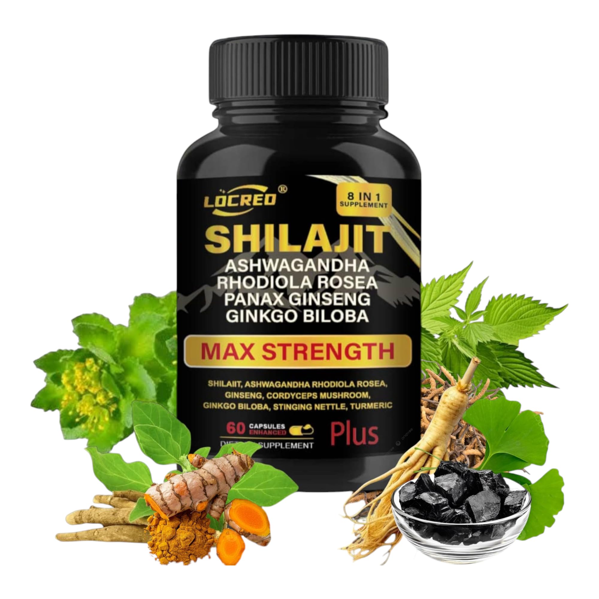LOCRED Shilajit Capsules for Men & Women 8 in 1 with Shilajit 18000 mg Ashwagandha Ginseng Ginkgo Rhodiola Cordiceps Natural Energy & Stamina Supplement for Men 60 Capsules.