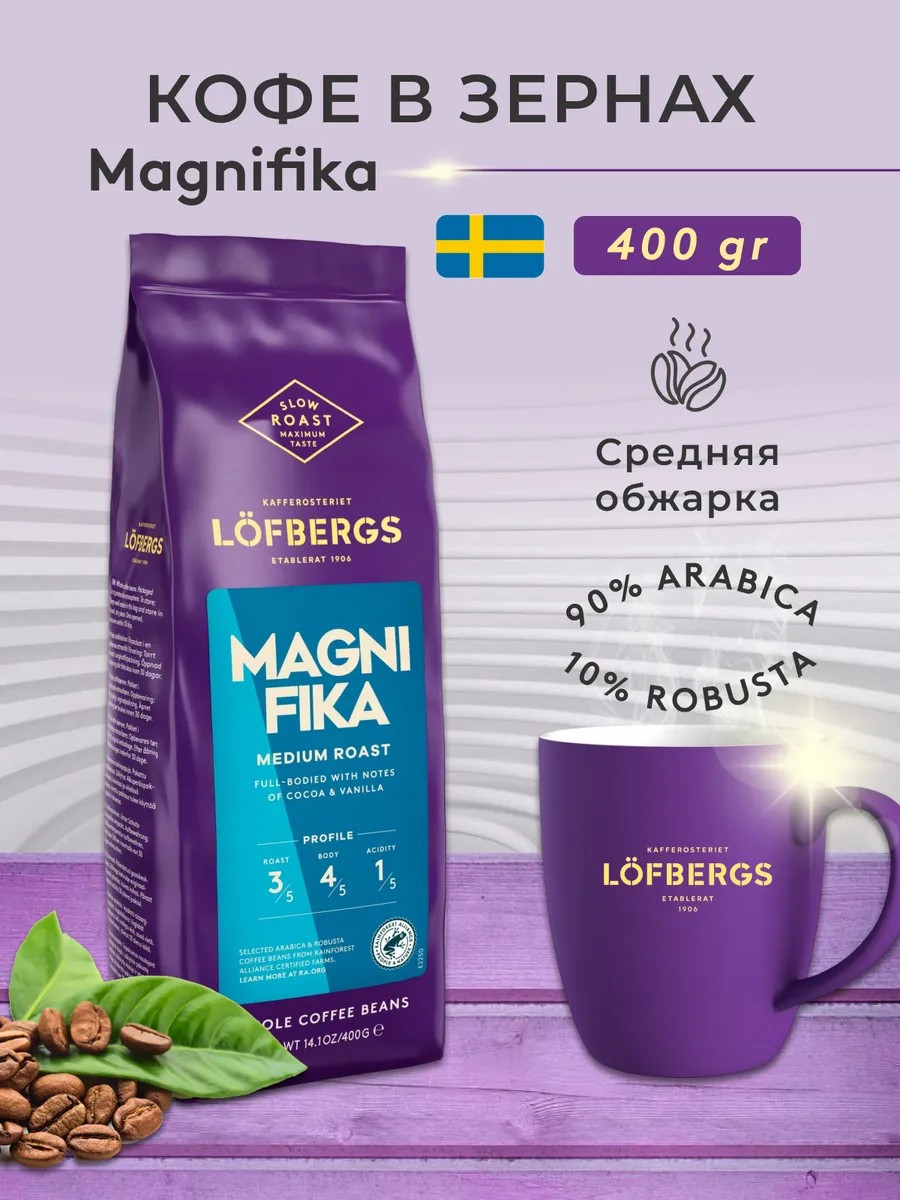Бренд Лофбергс это премиальный шведский кофе, который начал свою историю в далеком 1906 году как небольшое семейное предприятие. Сегодня кофе Lofbergs это лидер скандинавского рынка кофе с передовым производством и многомилионной аудиторией своих поклонников. Основу почти всех смесей составляет 100% арабика из Южной и Центральной Америки, а так же стран восточной Африки. Зеленый кофе отбирается самым тщательным образом с соблюдением самых строгих экологических норм. Доказательством тому служит наличие экологических сертификатов Rainforest Alliance (RA) и UTZ. Ассортимента кофе Lofbergs передает философию и традиции шведской кофейной культуры, в которой наиболее распространённым способом заваривания является фильтр кофе. К такому варианту приготовления относятся все способы, в которых молотый кофе помещается в специальный фильтр и через него проходит горячая вода. После экстракции готовый напиток стекает в специальную чашу, а отработанный кофейный жмых извлекается вместе с фильтром, который может быть многоразовым или одноразовым. Традиционный шведский кофе готовится в основном в кофеварке. Помимо традиционных способов заваривания, Lofbergs предлагает вариант кофе для рожковых эспрессо кофеварок. Для получения плотной пенки Крема многие производители добавляют в состав смеси небольшое количество робусты. Кофе получается более насыщенным, а пенка более устойчивой. Magnifika содержит в своем составе небольшое количество робусты и это хороший вариант кофе для рожковой кофеварки. В том числе, Магнифика подойдет и для капельной кофеварки, если Вы любите более крепкий кофе с выраженной горчинкой.