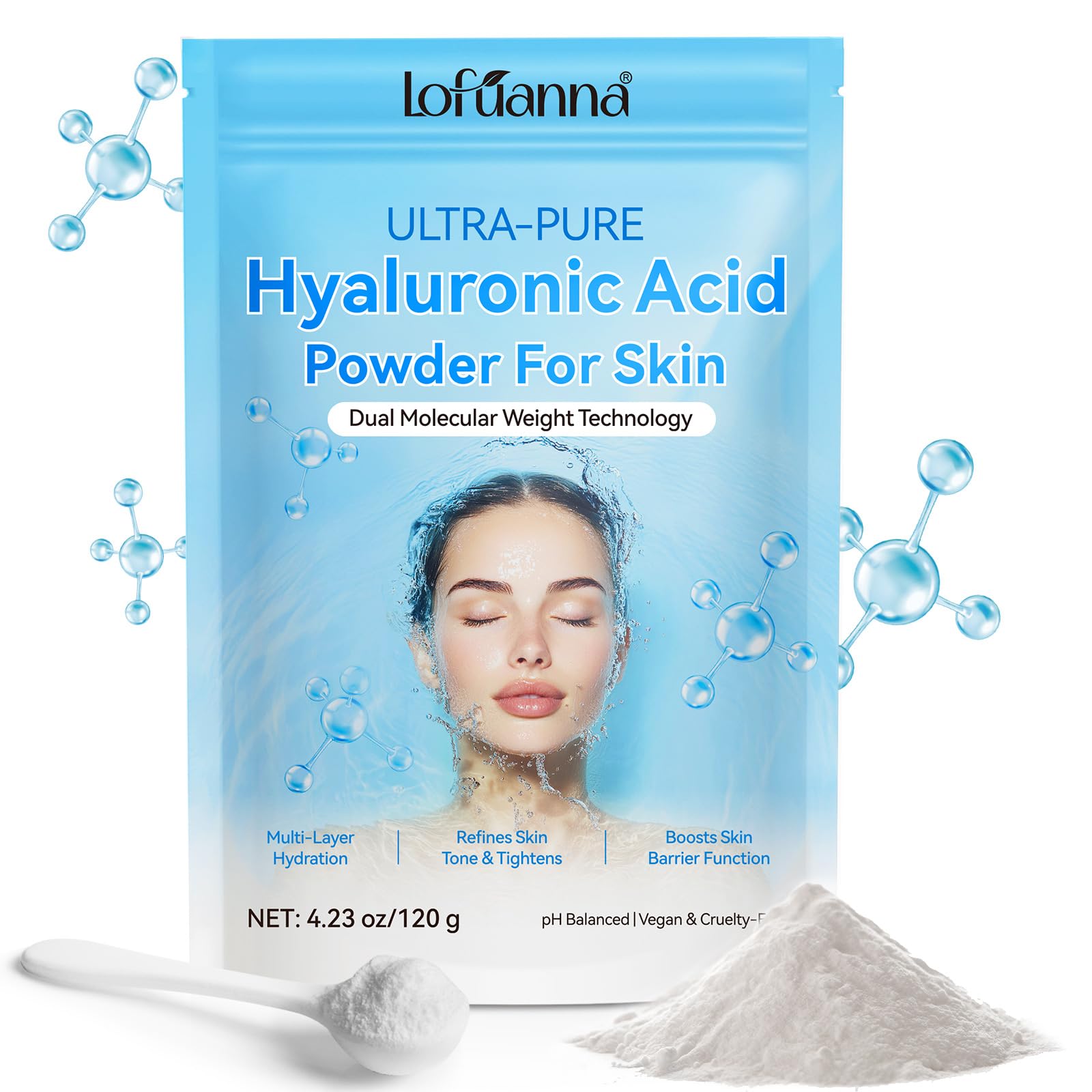 100 pure ingredients: Hyaluronic acid powder is highly effective and guilt-free. It contains no preservatives, fragrances, pigments or additives. Suitable for all skin types, ingredient enthusiasts, and those who seek simple and effective skincare. Deep Skin Hydration: The fine powder texture dissolves quickly in water, easily mix it with serums, creams, or face masks.Create customized facial mists, hydrating masks, or lightweight serums effortlessly,perfect for DIY skincare enthusiasts. Easy to Use:3g of hyaluronic powder can makes 100ml of serum, just add 3g of hyaluronic acid powder to 100ml of purified water and wait for the solution to turn into a clear serum.Package comes with a spoon, 1 full spoon of powder weighs approximately 1g. Deep Hydration Powder:This powerful hyaluronic powder locks in moisture, boosts collagen production and improves elasticity for firmer, smoother skin. Hyaluronic Acid Powder: Lofuanna pure water soluble hyaluronic acid powder formulated with high-quality low molecular weight, Filler Free Ingredients. Deeply penetrate the skin's base, providing a more long-lasting and deep moisturizing experience.