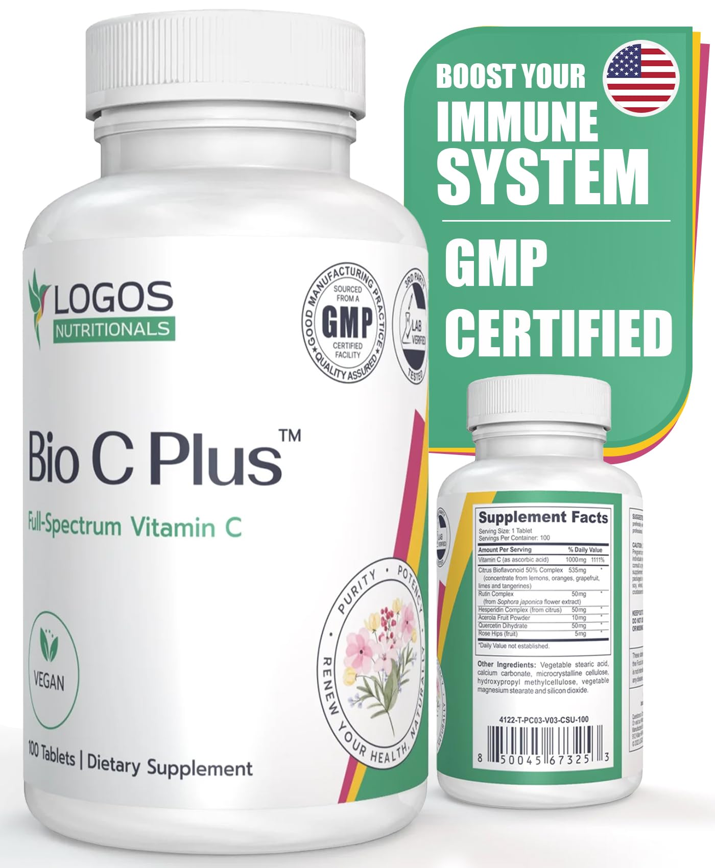 QUALITY ASSURANCE: Within a GMP-certified facility, our Vitamin C pills are derived from all-natural ingredients sourced as the most bio-available form of pharmaceutical-grade raw materials. This process is dedicated to maintaining high standards of quality. BIO C PLUS, MADE IN USA: Experience the excellence of Logos Nutritional Vitamins C tablets—formulated in the USA within a GMP certified facility. Choose Bio C Plus for a reliable and convenient option, delivering the effectiveness of vitamin C 1000mg supplements. COLLAGEN IRON ABSORPTION: Our vegan Vitamin C tablets boost collagen production, supporting healthy joints, while enhancing iron absorption for improved energy and vitality. As Vitamin C is water-soluble, any excess is naturally expelled, making it safe for daily use in your health regimen. IMMUNE HEALTH SUPPORT: Assist your immune system and combat free radicals with our advanced formula. Vitamin C is essential for immune defense and acts as a powerful antioxidant, neutralizing free radicals to protect against aging, illness and various chronic diseases. BLEND OF NATURAL SOURCES: Bio C Plus delivers natural Vitamin C from Ascorbic Acid with a rich blend of bioflavonoids from lemons, oranges, grapefruit tangerines, along with Rutin, Hesperidin, Acerola, Quercetin and Rose Hips, supporting skin health and overall well-being.