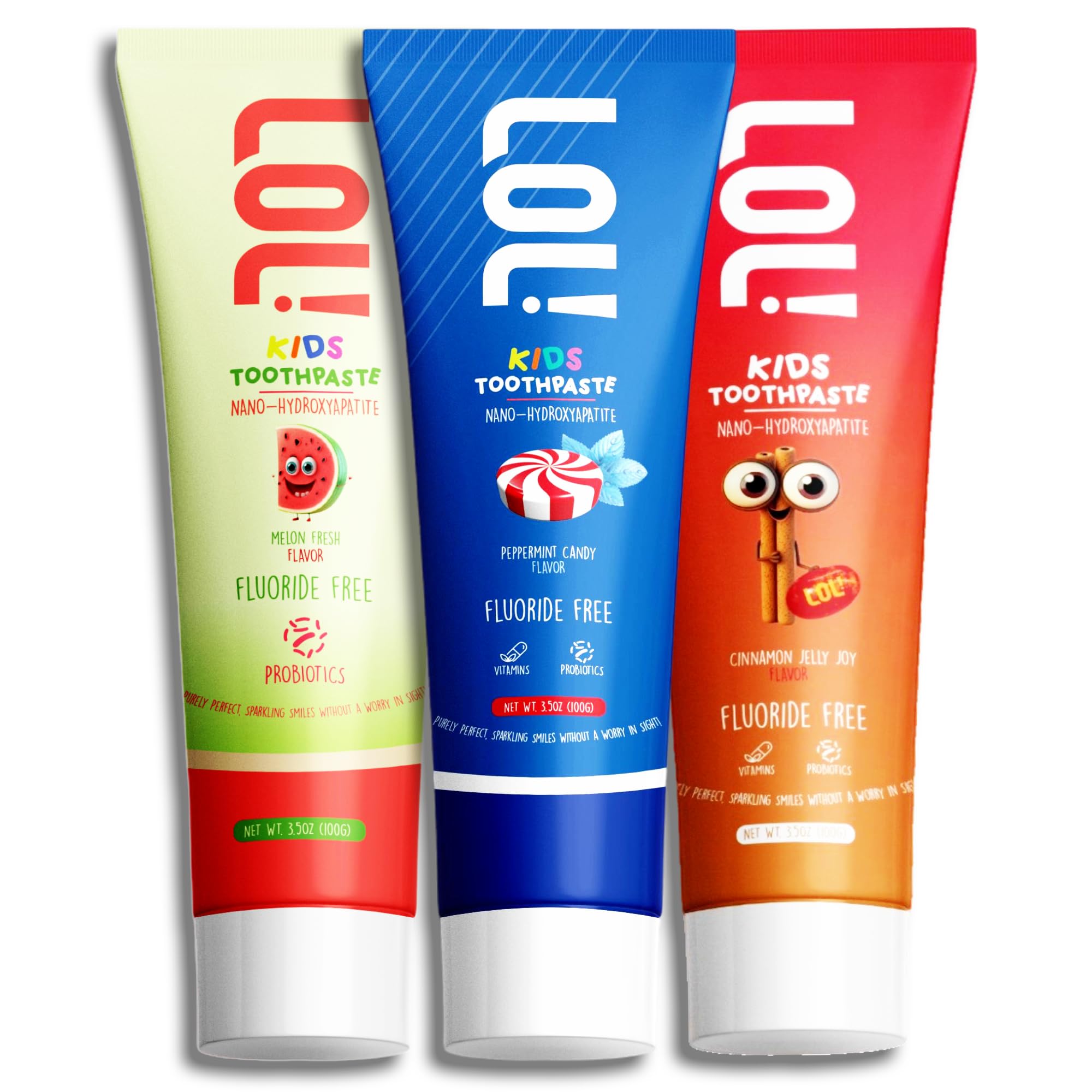 LOL Kids Toothpaste 3-Flavors Pack | Nano Hydroxyapatite Toothpaste Probiotics Vitamins A C E | Safe if Swallowed No SLS | 1 Peppermint 1 Cinnamon & 1 Melon Flavor
