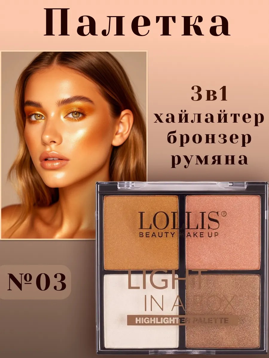 Палетка для макияжа лица Highlighter Palette 4 турецкого бренда декоративной косметики для женщин Lollis - идеальное средство для создания сияния и подчеркивания контуров лица. Компактная палетка позволит вам с легкостью скульптурировать и добавить глубину вашему макияжу, придавая ему естественное сияние. Любимые хайлайтер, бронзер и румяна Лоллис объединены в этой чудесной палитре, которая станет вашим незаменимым спутником в течение всего дня. Невероятно мягкая и шелковистая текстура позволяет равномерно наносить и легко растушевывать продукт, не оставляя видимых границ и переходов. Сухой хайлайтер для лица с помощью кисточки придает вашей коже невероятное мерцание, отражая свет и придавая вам непревзойденный шик.