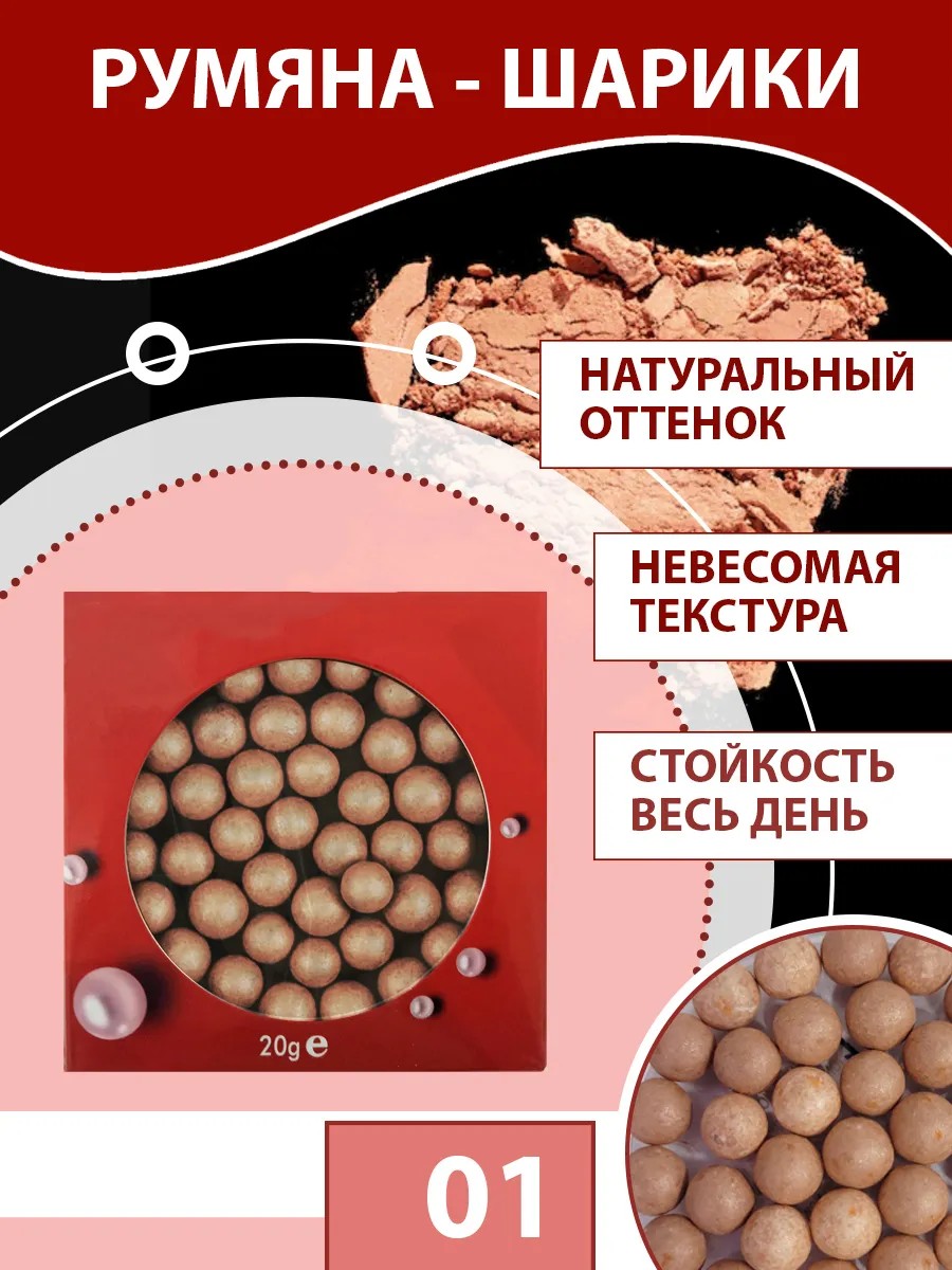 Румяна шариковые для макияжа - ваши лучшие помощники для любого образа! Невероятные мультитональные оттенки румян легко смешиваются, чтобы вы могли создать румянец любой интенсивности. Шариковые румяна для лица идеально подходят для создания нежного румянца или придания выразительности скулам благодаря особой формуле, позволяющей регулировать интенсивность цвета. Советы визажиста: Для идеального нанесения обмакните мягкую чистую кисть в румяна и стряхните излишки. Нанесите румяна на яблочки щек и растушуйте небольшими круговыми движениями. Создайте желаемую интенсивность цвета. Если необходимо смягчить тон - просто нанесите сверху немного прозрачной пудры. Румяна шариковые идеально подчеркивают черты лица и дарят сияющий оттенок загара. Косметика прекрасно подходит для макияжа дневного и вечернего. Косметическое средство оставляет легкий сияющий финиш. Преимущества румян для лица: дарят легкое сияние, обеспечивают эффект загара, нежная текстура и мягкое покрытие. Подходят к спортивной одежде, деловому костюму и вечернему платью. Способ применения: наберите румяна шарики на кисть круговыми движениями. Удалите излишки, слегка встряхнув кисть. Нанесите румяна круговыми движениями на яблочки щек и растушуйте на скулы по направлению к вискам. Смешивайте, придавайте легкий румянец или скульптурность лицу.