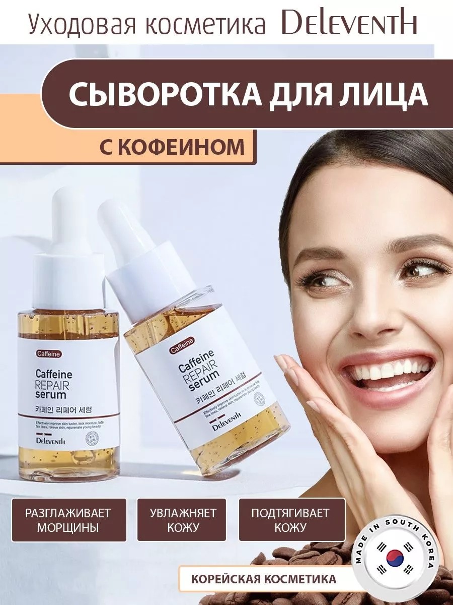 Уходовая косметика Deleventh предлагает вашему вниманию сыворотка для кожи лица с КОФЕИНОМ обладает регенерирующим свойством с мгновенным эффектом омоложения кожи. Сыворотка для лица борется с несовершенствами кожи, выравнивают тон кожи, помогают справиться с последствиями акне (постакне ) и борется с пигментацией, активизируют процесс выработки гиалуроновой кислоты, повышают эластичность кожи и ускоряют клеточную регенерацию, борется с возрастными изменениями. Легкая текстурированная формула сыворотки для кожи лица тонизирует кожу, визуально делая ее более подтянутой и молодой. Стимулирует приток крови к коже и выводит токсины, улучшает цвет лица, смягчает и разглаживает кожу, борется с преждевременным старением, стимулирует синтез коллагена и гиалуроновой кислоты. Подходит для всех типов кожи, особенно для сухого, нормального и жирного типа кожи. Использовать с 18 лет. Способ применения: нанесите несколько капель косметического средства на очищенную кожу, после полного впитывания рекомендуется нанести крем.