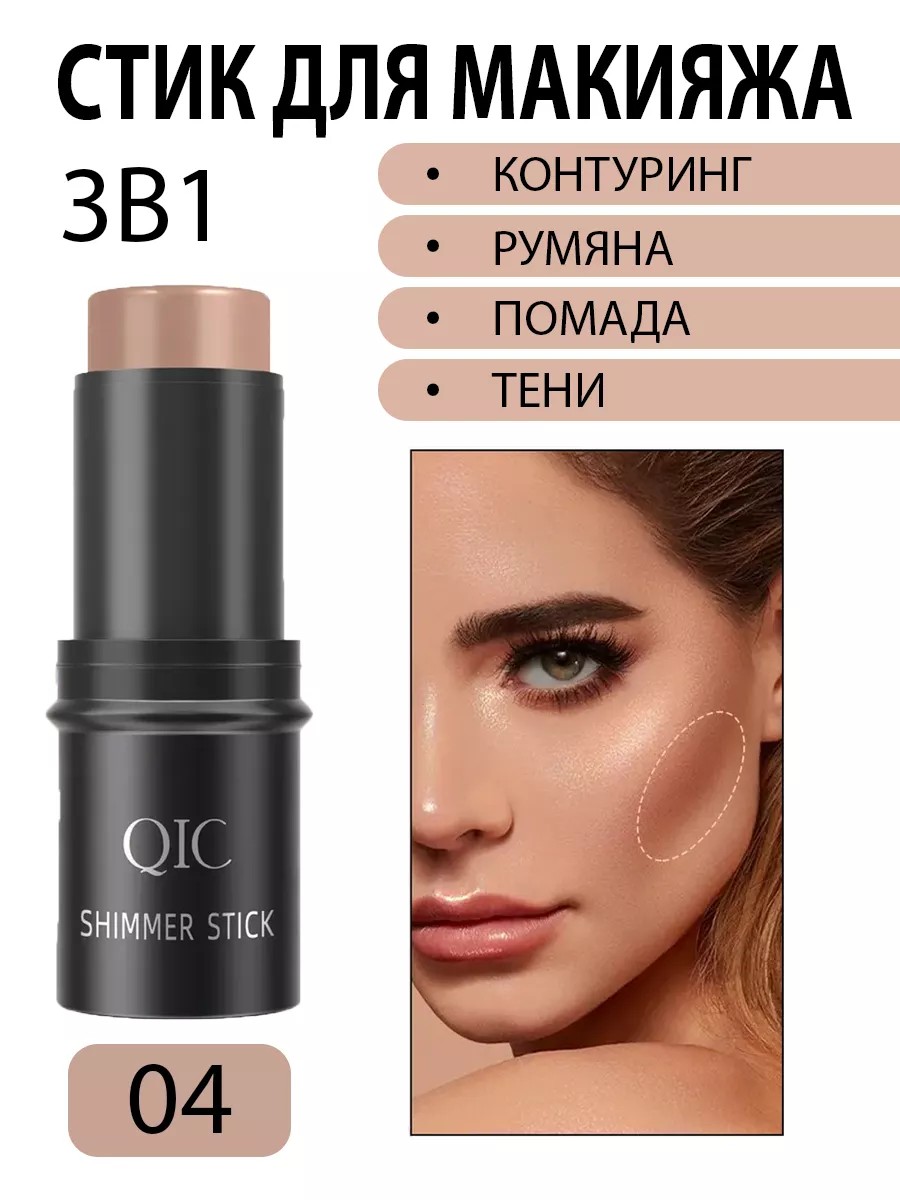 Румяна стик для лица QIC в формате толстого карандаша 3 в 1 для лица, для губ, для щек, для глаз. Стик-румяна - это многофункциональный продукт для контуринга и скульптурирования лица одним движением придаст коже свежий и сияющий вид. Нежная текстура румян для макияжа равномерно распределяется, быстро фиксируется на поверхности лица, поддается растушевке, что позволяет добиться максимально естественного финиша. Светоотражающие микрочастицы жидких румян придают эффект здоровой упругой кожи. Кремовые румяна стик для лица очень удобны, можно использовать не только для щек, но и для век, и для губ. Кремовые румяна в стике объединяют в себе несколько средств, что делает их по-настоящему универсальными. Румяна можно использовать как помаду, как тени для век кремовые и как румяна. Способ применения: нанесите румяна на необходимые участки, можно растушевать кистью-дуофиброй, спонжем, для более тонкого эффекта - пальцами.