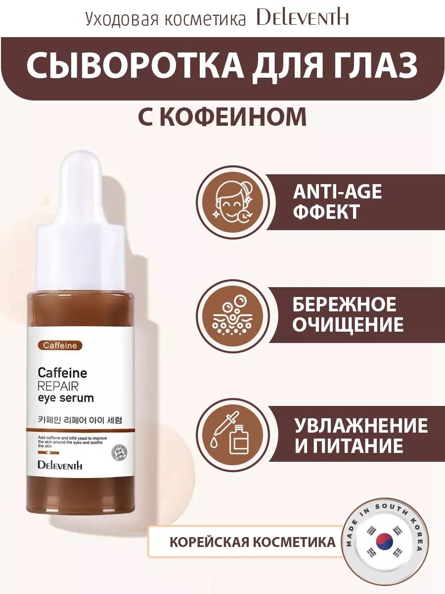 Корейская косметика для кожи вокруг глаз Delevent поможет вам достичь красивой и практически идеальной кожи. Сыворотка для области вокруг глаз с кофеином против отечности и темных кругов. Легкая текстурированная формула сыворотки для глаз помогает снять отек или не допустить его в будущем, эффективно борется с мешками под глазами и слегка тонизирует кожу, визуально делая ее более подтянутой и молодой. Сыворотка для кожи вокруг глаз стимулирует приток крови к коже и выводит токсины. Экстракт «зелёного чая» улучшает цвет лица, смягчает и разглаживает кожу, борется с преждевременным старением. Экстракт зелёного кофе в высокой концентрации снимает отечность и пастозность в области век. Убирает утреннюю припухлость, помогает убрать мешки и темные круги, а также стимулирует синтез коллагена и гиалуроновой кислоты. Подходит для всех типов кожи, особенно для сухого, нормального и жирного типа кожи. Использовать с 18 лет. Способ применения: нанесите несколько капель косметического средства на очищенную кожу, после полного впитывания рекомендуется нанести крем. Способ применения: нанесите средство на очищенную кожу и распределите массирующими движениями. Также возможно использовать как ампульная сыворотка для мезороллера для массажа вокруг глаз. Все средства подходят для любого типа кожи: для сухой, чувствительной, нормальной, жирной, комбинированной, возрастной, с признаками старения и проблемной кожи. Профессиональная косметика для лица - ваш уход за лицом. Оригинальная уходовая косметика женская для лица из Кореи для чистой и здоровой кожи.