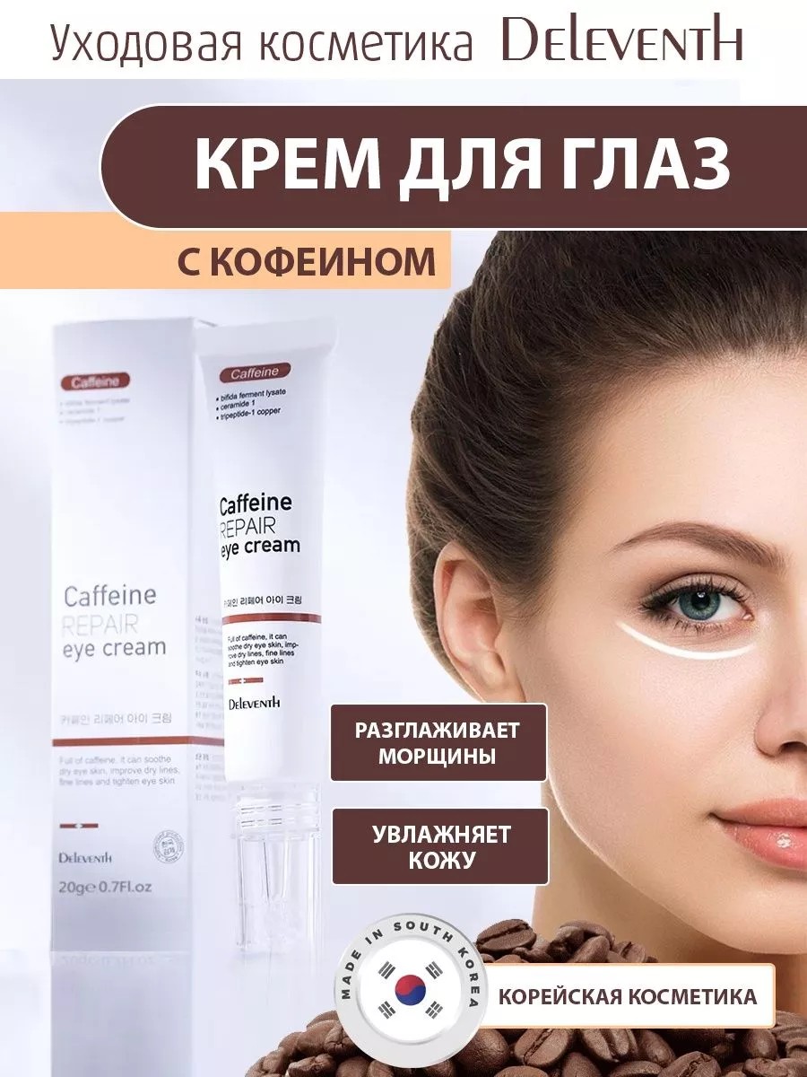 Уходовая корейская косметика для ухода за кожей 1. Корейский КРЕМ С КОФЕИНОМ для кожи под глазами. Крем для глаз с кофеином устраняет круги под глазами и отечность, а также помогает разгладить появление тонких линий и морщин. Кофеин и гиалуроновая кислота проникают в поверхность кожи, увлажняют, питают кожу вокруг нежной области вокруг глаз. Корейский крем для кожи вокруг глаз за счет кофеина стимулирует синтез коллагена для повышения упругости, борется с отеками, разгоняя застоявшуюся жидкость, а также осветляет пигментные пятна. Уменьшает темные круги и морщинки вокруг глаз, удаляет свободные радикалы вокруг глаз и улучшает внешний вид. Крем для кожи вокруг глаз восстанавливает, увлажняет, укрепляет и ухаживает за вашей кожей. Крем заметно разглаживает морщины, уменьшает темные круги под глазами, укрепляет защитный барьер. Кофеин превосходно предотвращает мешки и тусклость под глазами, помогает сокращать ткани и кровеносные сосуды, укрепляя их и предотвращая появление тонких линий. Крем для кожи вокруг глаз разработан специально для ухода за лицом. Способ применения: наносите крем утром и/или вечером осторожно на область вокруг глаз распределяя средство от внутреннего уголка глаза к внешнему, не растягивая кожу век.