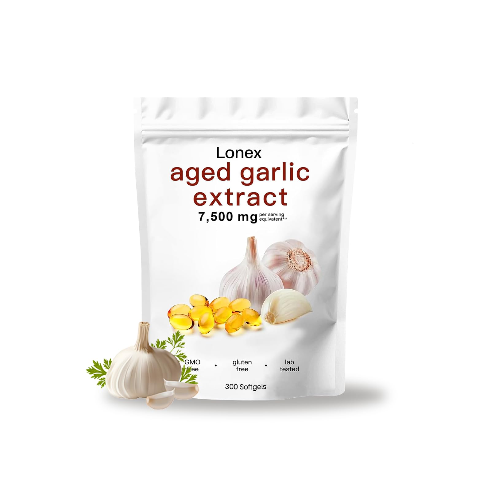 Lonex Aged Garlic Extract 7500mg Odorless Organic Garlic Capsules for Heart & Immune Antioxidant Supplements Vegetarian All-Natural Non-GMO Gluten-Free 300 Softgels