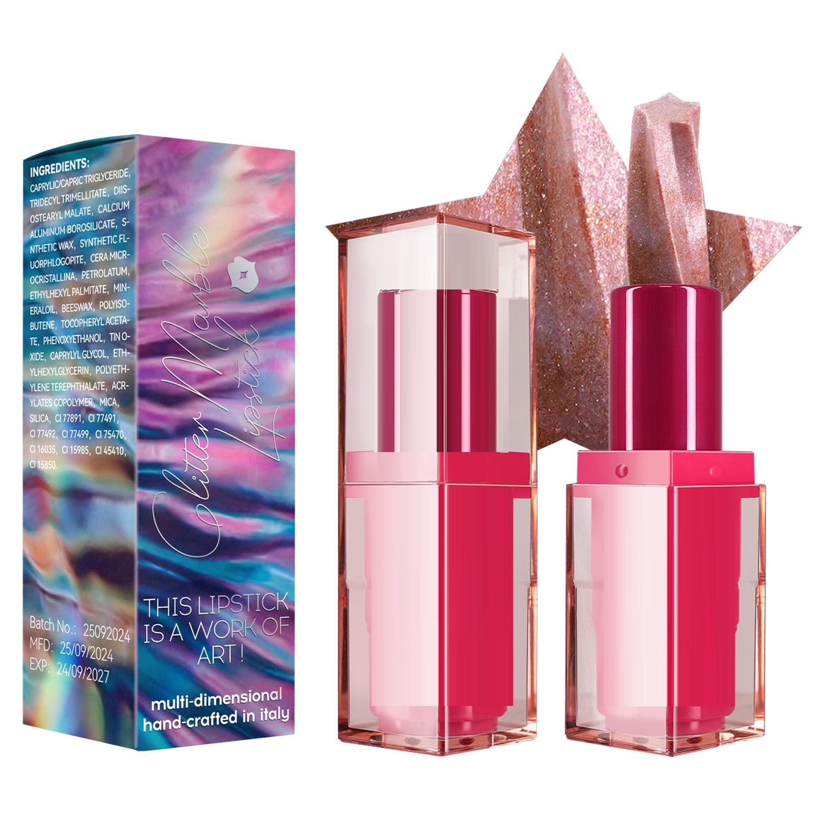 Get the perfect glittery lips for shopping, summer parties, and special occasions with our glitter lip gloss for safe and long-lasting color development. Experience the magic of metallic glitter lipstick, formulated to keep your lips sparkling and ready for any event. Product Features: Net Contents: 2.6 g Products: 1 Glitter Lipstick for Women SAFETY WARNING Not applicableInstant Blow-Up: Reinvent your lip game with a metallic lipstick, for a pearly, light-infused finish that delivers enhanced luminosity and shine. Illuminate your pout perfectly in just a few strokes for a makeup effect that creates seductive and unique lips. Convenient Ready: Celebrate special occasions like birthdays and holidays with this shimmering lipstick—a great gift for every woman. Add a touch of brightness to your beauty routine and make a statement with every use. Perfect for Christmas and Thanksgiving. Wide Range of Uses: From a casual day out to a formal event, our lipstick is ideal for all occasions: business, dates, everyday life, and summer parties. Its versatile nature makes it a must-have makeup item that makes lips shine and is ideal for all makeup seasons. Long-Lasting Color Ideal: Unleash your inner sparkle with our shimmering lipstick for women. The unique formula ensures long-lasting color development, and the lip gloss maintains its brilliant color and shine for hours, making it ideal for any occasion. Healthy ingredients: Elevate your lip game with our shimmering lipstick made from natural and gentle ingredients. Safe, high-quality materials are carefully selected to ensure a luxurious feel and a radiant smile.Rouge à lèvres brillant longue durée - rouge à lèvres de maquillage, lèvre hydratante pour rouge à lèvres paillettes, cosmétiques imperméables, rouge à lèvres longue durée pour les fêtes 4 1 unità (Confezione da 1)DESCRIPTION DU PRODUIT DESCRIPTION DU PRODUIT Obtenez les lèvres pailletées parfaites pour le shopping, les fêtes d'été et les vacances spéciales avec notre brillant lèvres pailletées pour le développement de couleurs sûr et durable. Expérimentez la magie du rouge à lèvres brillant pour métal, formulé pour garder vos lèvres scintillantes et prêtes pour toutes les occasions. Caractéristiques du produit : Contenu net : 2,6 g. des produits 1 rouge à lèvres scintillant pour femme AVERTISSEMENT DE SÉCURITÉ non applicableBlow-up instantané : renouvelle votre jeu à lèvres avec un rouge à lèvres en métal, pour une finition nacrée et infusée en lumière qui produit une luminosité et une brillance améliorées. Illuminez votre moue idéalement en quelques coups pour un effet de maquillage pour des lèvres séduisantes et uniques. PRÊT PRATIQUE: célébrez des occasions spéciales comme des anniversaires et des vacances avec ce rouge à lèvres scintillant, un bon cadeau pour chaque femme. Ajoutez une touche de luminosité à votre routine de beauté et faites une déclaration à chaque utilisation. Pour Noël et Thanksgiving. Large gamme d'utilisations : qu'il s'agisse d'une journée décontractée ou d'un événement formel, notre rouge à lèvres est idéal pour toutes les occasions : affaires, rendez-vous, vie quotidienne et fêtes d'été. Sa nature polyvalente en fait un objet de maquillage indispensable qui fait briller les lèvres et idéal pour les saisons de maquillage. Idéal de couleur longue durée : déchaînez votre intérieur brillant avec notre rouge à lèvres étincelant pour femme. La formule unique rend le développement de la couleur durable et le glaçage pour les lèvres peut conserver sa couleur et son éclat brillants pendant des heures, ce qui le rend idéal pour toutes les occasions. Ingrédient sain : améliorez votre jeu de lèvres avec notre rouge à lèvres étincelant fabriqué à partir d'ingrédients naturels et délicats. Les matériaux sûrs et de haute qualité sont soigneusement sélectionnés pour vous assurer une sensation luxueuse et un sourire éclatant.