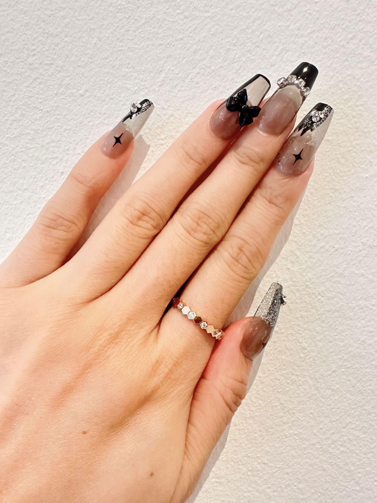 Long Squoval Transparent Black Base French Bow Crystal Star Fake Press On Nails