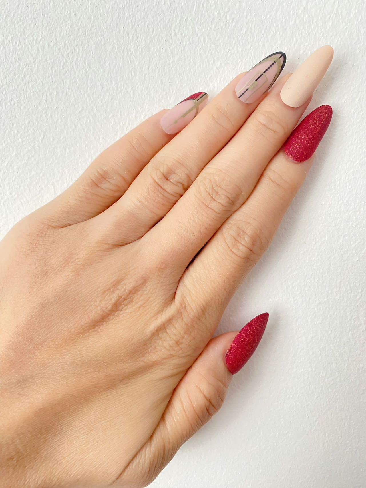 Long Stiletto/Almond Red Matte Glitter with Black Stripe Fake Press On Nails