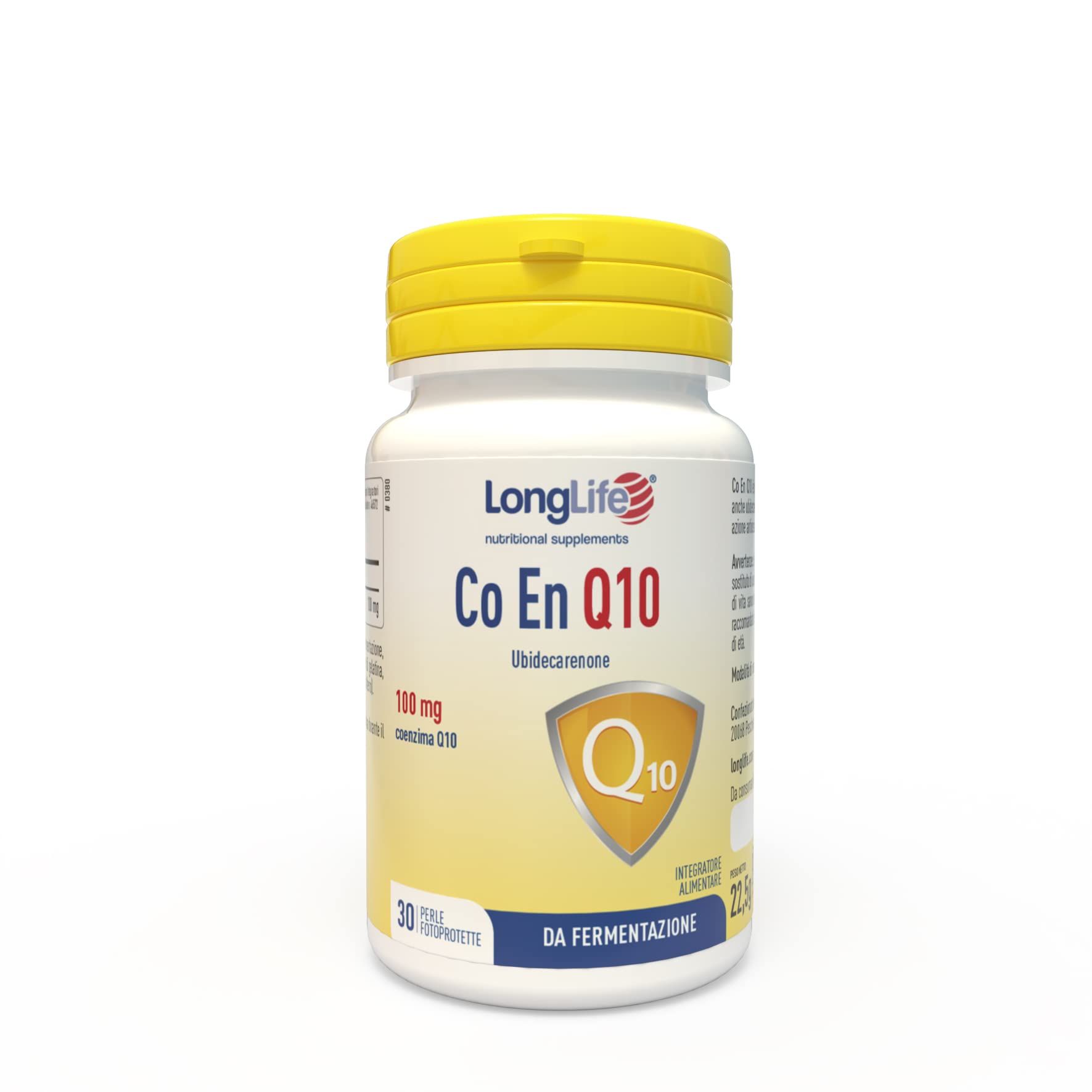 LongLife Co En Q10 is a photoprotected pearl supplement based on coenzyme Q10, also known as ubidecarenone, obtained through bacterial fermentation according to the highest quality standards. Coenzyme Q10 is a fat-soluble factor similar to vitamin D, with antioxidant action and protection against skin aging caused by free radicals. It is particularly beneficial against photoaging, caused by sun exposure and ultraviolet rays. Co En Q10 is present in every cell of our body and is considered an essential element in all tissues where energy consumption is higher, such as the heart, muscle tissue, and nervous system. Involved in ATP synthesis and all cellular processes that produce energy, it is also beneficial during physical activity to improve endurance and aerobic capacity. Its levels in the body decline with age, at which point coenzyme Q10 supplementation becomes particularly important. Finally, it is also useful when taking statins. INGREDIENTS Ingredients: Soybean oil, fermented coenzyme Q10, 100 mg emulsifiers (soybean lecithin and beeswax). Gelatin pearl, firming agent (glycerol), color (iron oxide). DIRECTIONS Directions: One (1) or two (2) pearls daily with water during a meal. SAFETY WARNING Warnings: Food supplements should not be considered a substitute for a varied diet and should be used as part of a healthy and balanced lifestyle. Do not exceed the recommended daily intake. Keep out of reach of children under 3 years of age. See moreSustainability and safety: All our food supplements are produced using energy from 100 renewable sources. The LongLife jar, made of R-PET plastic, is 100 recyclable and 100 recycled after the pigment has been used up. Each package is protected by a technology three times more effective: a seal to isolate against external agents, a tamper-evident cap, and a protective film against dust and moisture. Energy and stamina: Coenzyme Q10 is a cofactor in cellular energy production, also beneficial during sports activities, especially for improving stamina and aerobic capacity and supporting tissues where energy consumption is higher, such as the heart, muscles, and nervous system. It is also beneficial when taking statins. Antioxidant and anti-aging: The coenzyme Q10 in this LongLife product is a vitamin-like factor that plays an important antioxidant role against free radicals and skin aging, particularly against photoaging caused by ultraviolet rays. ? PRODUCTION EXCELLENCE: This LongLife supplement is based on coenzyme Q10 produced through bacterial fermentation, obtained according to the highest quality standards (GMP - Good Manufacturing Practice). Italian Quality: LongLife is the leading Italian company in the production of excellent quality food supplements. The company's food safety management system, based on the HACCP method, is certified according to strict international standards such as the US Good Manufacturing Practice (FDA) and Food Safety System Certification 22000. Our products are also certified Play Sure Doping Free.LongLife CO EN Q10 100mg Coenzyme Q10, ubidécarénone pur Antioxydant et proénergétique De fermentation 30 perles photoprotégées Sans glutenDESCRIPTION DU PRODUIT DESCRIPTION DU PRODUIT LongLife CO EN Q10 est un complément en perles photoprotégées à base de coenzyme Q10, également appelé ubidécarénone, obtenu par fermentation bactérienne selon les normes de qualité les plus élevées. La coenzyme Q10 est un facteur liposoluble similaire à la vitamine à action antioxydante et contre le vieillissement de la peau causé par les radicaux libres. Il est particulièrement utile contre le photo-aging, dû à l'exposition solaire et aux rayons ultraviolets. Le Co En Q10 est présent dans chaque cellule de notre corps et est considéré comme un élément indispensable dans tous les tissus où la consommation d'énergie est plus élevée, comme le cœur, le tissu musculaire et le système nerveux. S'impliquant dans la synthèse de l'ATP et dans tous les processus cellulaires qui produisent de l'énergie, il est également utile en cas d'activité sportive pour améliorer la résistance et la capacité aérobique. Ses niveaux dans l'organisme diminuent avec l'âge, quand une complémentation de coenzyme Q10 devient particulièrement importante. Enfin, il est également utile en cas de prise de statines. INGRÉDIENTS Ingrédients : Huile de SOIA, coenzyme Q10 de fermentation, 100 mg émulsifiants (lécithine de SOIA et cire d'abeille). Perle de gélatine, agent de résistance (glycérol), colorant (oxyde de fer). MODE D'EMPLOI Mode d'emploi : une (1) ou deux (2) perles par jour avec de l'eau pendant le repas. AVERTISSEMENT DE SÉCURITÉ Avertissements : les compléments alimentaires ne doivent pas être considérés comme substitut à une alimentation variée et doivent être utilisés selon un mode de vie sain et équilibré. Ne pas dépasser la dose quotidienne recommandée. Tenir hors de portée des enfants de moins de 3 ans. Voir plusDurabilité et sécurité : tous nos compléments alimentaires sont produits en utilisant de l'énergie à partir de sources 100 renouvelables. Le bocal LongLife en plastique R-PET est 100 recyclable et 100 recyclé après consommation au net du pigment. Chaque emballage est protégé par une technologie trois fois plus efficace : un sceau pour isoler des agents extérieurs, un bouchon inviolable et un film de protection contre la poussière et l'humidité. Énergie et résistance : la coenzyme Q10 est cofacteur dans la production d'énergie cellulaire, utile également en cas d'activité sportive, surtout pour améliorer la résistance et la capacité aérobique et soutenir les tissus où la consommation d'énergie est plus importante comme le cœur, les muscles et le système nerveux. Utile également en cas de prise de statines. Antioxydant et anti-âge : la coenzyme Q10 contenue dans ce produit LongLife est un facteur similaire à la vitamine qui joue une importante fonction ant