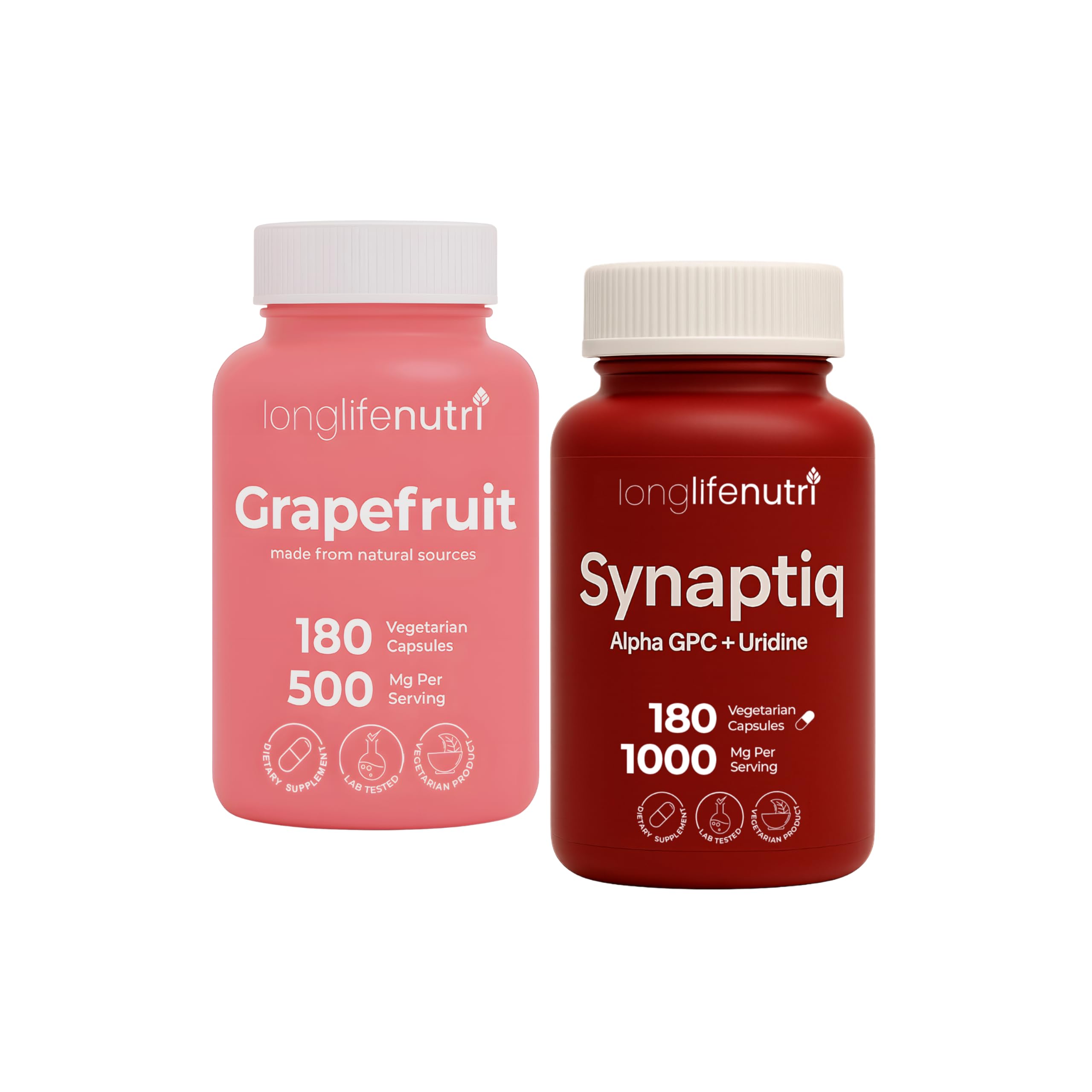 LongLifeNutri Grapefruit Seed Extract 500 mg Synaptiq 1000 mg – Dual Daily Support Bundle (Vegan Capsules, 6-Month 3-Month Supply) Experience balanced daily support with this two-part wellness bundle featuring our fruit-sourced Grapefruit Seed Extract and cognitive-focused Synaptiq. Each set provides convenient, clean-label capsules made for everyday energy and mental clarity—without added sugars or fillers. Why Choose This Bundle? Balanced Daily Focus – Combines the natural citrus bioflavonoids of Grapefruit Seed Extract with Synaptiq's Alpha GPC Uridine Monophosphate for daily mental alignment and vitality. Extended Supply – Includes a 6-month bottle of Grapefruit Seed Extract (180 capsules) and a 3-month bottle of Synaptiq (180 capsules). Clean, Thoughtful Formulations – Vegan, soy-free, and made without artificial additives for mindful supplementation. What You Get 1 × LongLifeNutri Grapefruit Seed Extract – 500 mg, 180 vegan capsules (6-month supply) 1 × LongLifeNutri Synaptiq – 1000 mg, 180 vegan capsules (3-month supply) 1 × Free Pill Organizer Quality Commitment Made in the USA in cGMP-certified facilities Third-party tested for purity, potency, and label accuracy Vegan-friendly, non-GMO, and gluten-free formulations Intended for general wellness. This product is not intended to diagnose, treat, cure, or prevent any disease.
