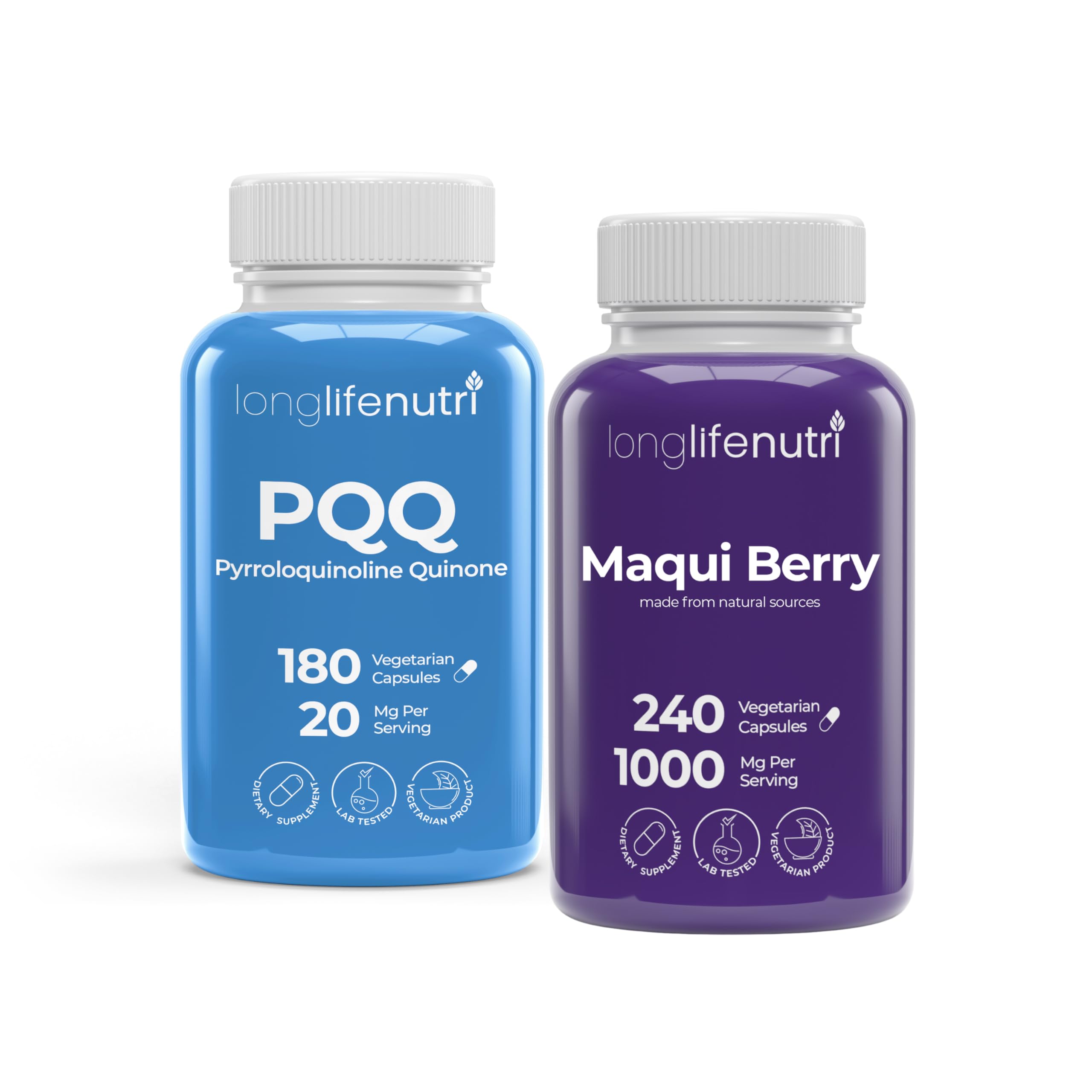 LongLifeNutri PQQ 20 mg + Maqui Berry 100 mg Bundle - 180 + 240 Vegetarian Capsules 6-4 Month Supply Mental Performance & Antioxidant Superfruit GMP Certified Made in USA