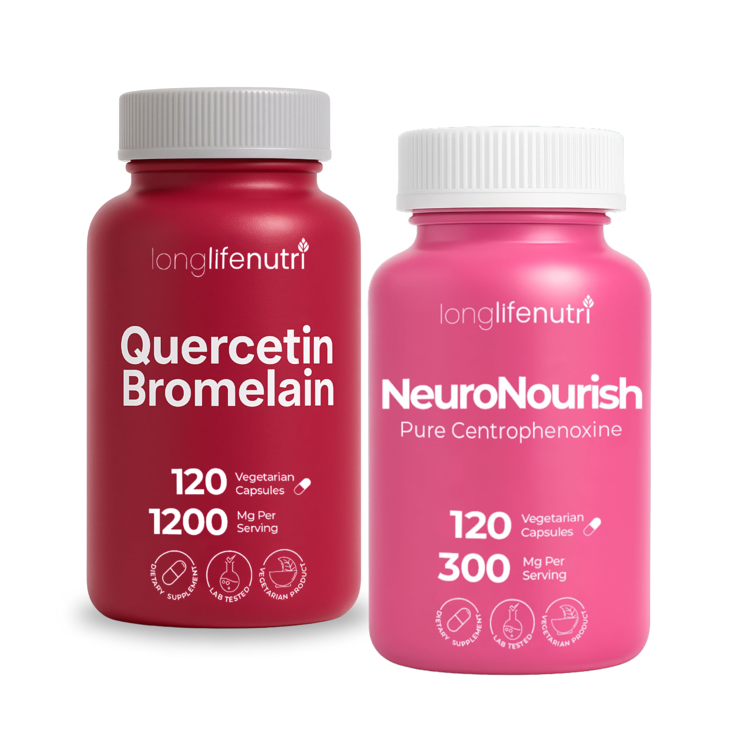 LongLifeNutri Quercetin 1000 mg Centrophenoxine 300 mg Bundle – Two-Bottle Set An intentional pairing of plant-based nutrients and time-tested nootropics. This bundle brings together our Quercetin Bromelain Complex with NeuroNourish Centrophenoxine in one convenient duo designed for those seeking daily support with a thoughtful combination of ingredients. Why Pair Quercetin Centrophenoxine? Well-Known Bioflavonoid Nootropic – Quercetin and Centrophenoxine are frequently included in supplement routines focused on balance, clarity, and everyday wellness. Complementary Nutrient Format – Bromelain complements quercetin in absorption and versatility, while Centrophenoxine includes DMAE and pCPA in a balanced daily serving. Longer-Term Support – This 2–4 month bundle gives you consistency for your routine, making it easy to stay on track with just two capsules daily. What You Get 1 × Quercetin 1000 mg with Bromelain 200 mg – 120 vegan capsules (2-month supply) 1 × Centrophenoxine 300 mg – 120 vegan capsules (4-month supply) 1 × Bonus LongLifeNutri 7-day pill organizer Pure Trustworthy Vegan, non-GMO, and free of gluten, soy, dairy, and artificial additives. Manufactured in the USA in a GMP-certified facility and third-party tested for identity, potency, and purity. Protected by our 365-day money-back guarantee and responsive customer support. Intended to support general wellness. This product is not intended to diagnose, treat, cure, or prevent any disease.365-DAY CONFIDENCE GUARANTEE: Backed by our one-year satisfaction promise and includes a complimentary LongLifeNutri pill organizer to help you stay consistent, every day. MADE IN THE USA WITH QUALITY YOU CAN TRUST: Crafted in a GMP-certified facility under rigorous standards, ensuring identity, purity, and consistency in every capsule. CONVENIENT 2–4 MONTH SUPPLY: Includes 120 capsules of each formula, offering two to four months of uninterrupted support. ideal for staying on schedule without frequent reorders. CLEAN, COORDINATED FORMULAS: Both supplements are vegan, non-GMO, and free of gluten, soy, and artificial fillers, aligning with mindful wellness routines and transparent sourcing standards. BUNDLE FOR MIND AND MOTION: Quercetin 1000 mg with Bromelain 200 mg pairs naturally with Centrophenoxine 300 mg to support clarity, comfort, and consistency in your daily wellness habits, all in one convenient set.
