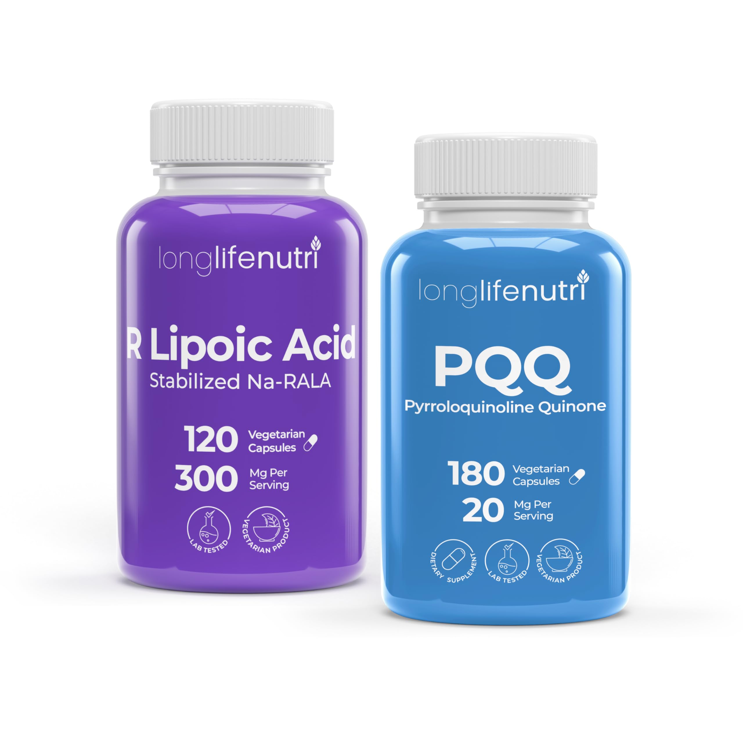 LongLifeNutri R-Alpha Lipoic Acid 300 mg + PQQ 20 mg Bundle - 120-180 Vegetarian Capsules Cellular Energy & Metabollic Function Daily Energy & Mental Performance GMP Certified Made in USA