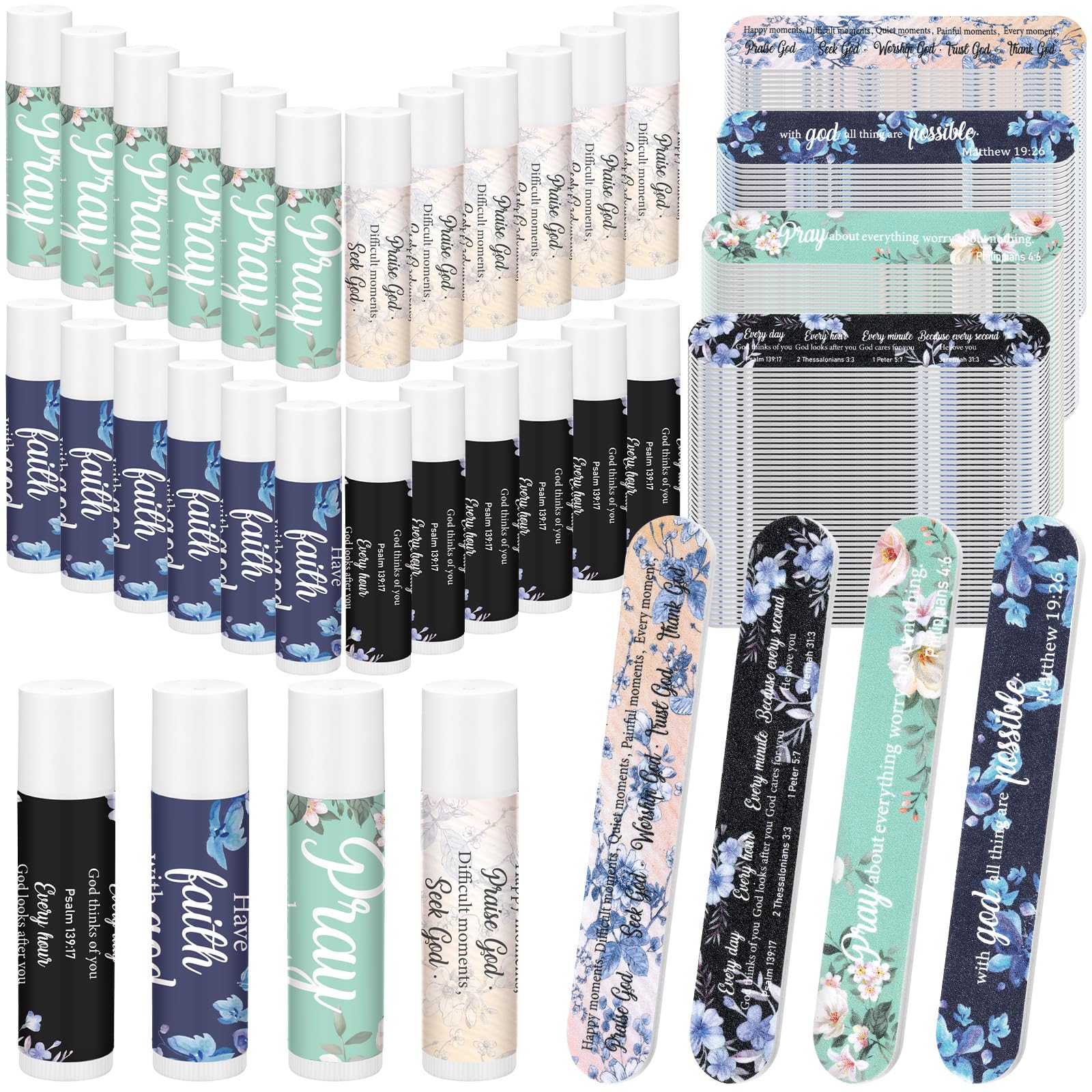 Features: Reliable and quality: Our moisturizing lipstick is printed with Bible scriptures, which can express your gratitude and love for guests and friends. The lipstick has a moisturizing and mild effect, which can prevent the lips from drying, cracking and premature aging. Moisturizing lips: This lipstick can provide moisturizing to the lips, making the lips smooth and refreshing, deeply nourishing dry lips, effectively relieving peeling and cracking, and building a moisturizing barrier for the lips on the day. Specifications: Color: blue, white Size: Lip balm: about 4.5g Nail File: 3.5 x 0.8 inches 9 x 2cm Package includes: 24 x Lip balms 24 x Nail Files Notes: Manual measurement, please allow slight errors on size. The color may exist a slight difference due to different screen displays. Our product is not suitable for sensitive skin. Test whether there is any allergy on a small part of your skin before use. Please stop applying if there is any discomfortComplete Set: we will provide you with a total of 24 pieces of lipstick and nail file Lipstick has the flavor of cherry blossom, vanilla, rose and coconut milk, which is sufficient in quantity to easily meet your needs and create an atmosphere for the occasion Those who receive these lipstick can also share them with friends or family Sufficient quantity for gatherings and gatherings. Wide Range of Uses: this Christian lip balm gift has a beautiful design, with meaningful words, suitable for parties, anniversaries, holidays, memorials, coworker thank you gifts, friends, siblings, birthday, and more. Ideal Gift: the lip balm features Christian themed sayings, and are suitable for adults, youth, women and men who have dry and chapped lips You can surprise your loved ones by giving them as party gifts, Christmas gifts and wedding gifts. Suitable Size: the Christian themed lipstick and nail file set has a capacity of 4.5g and is small and delicate The size of the nail file is about 3.5 x 0.8 inches 9 x 2cm Your guests will like these lipstick gifts They are small and exquisite They can be put in your suitcase, wallet and shopping bag, which is convenient for travel and outdoor carrying, and can meet your moisturizing needs during travel. Exquisite Design: each lipstick gift set has flowers and Bible copywriting design, which can bring you a positive mood and enhance the party atmosphere This charming and exquisite gift adds a touch of elegance and unexpected joy to church gatherings, making it an ideal souvenir for Christian gatherings, weddings, and birthday parties.