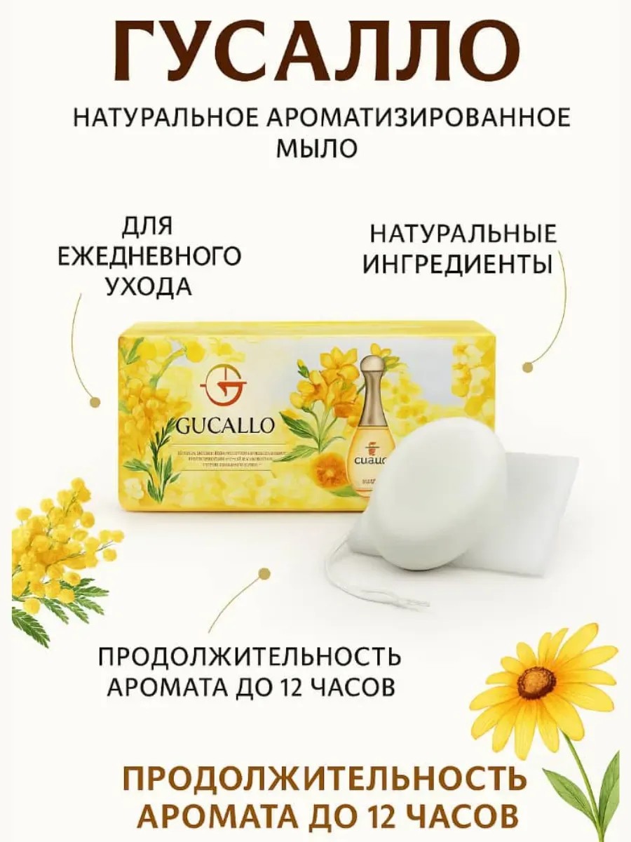 Натуральное ароматизированное мыло GUCALLO — это качественное средство для ежедневного ухода за кожей, созданное на основе натуральных ингредиентов, которое не только очищает, но и ухаживает за кожей, наполняя её приятным, стойким ароматом. Мыло обладает насыщенным и утончённым цветочно-травяным запахом, который сохраняется на коже до 12 часов, придавая ощущение свежести и ухоженности в течение всего дня.