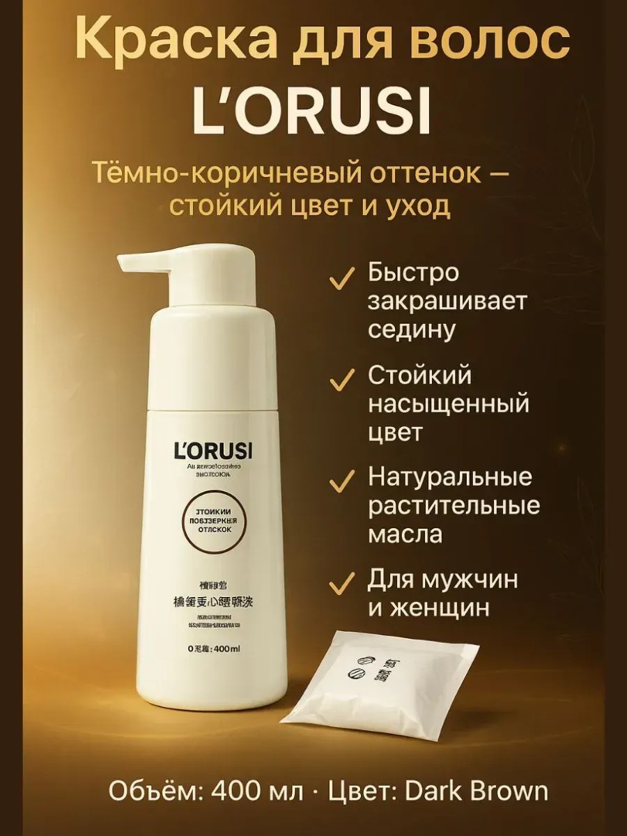 | Полное наименование товара | Краска для волос L’ORUSI Dark Brown тёмно-коричневый оттенок 400 мл стойкая профессиональная без аммиака натуральная растительная с маслами закрашивание седины для женщин и мужчин |