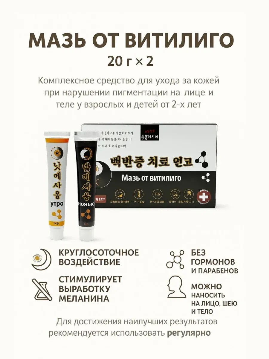 Мазь от витилиго — это специализированное средство для ухода за кожей, предназначенное для восстановления естественной пигментации и уменьшения выраженности депигментированных участков. Продукт можно использовать как у взрослых, так и у детей старше 2 лет, в том числе на деликатных зонах — лице, шее и области гениталий. Формула мази разработана с учётом особенностей кожи при витилиго и направлена на мягкое, но эффективное восстановление работы меланоцитов — клеток, отвечающих за выработку пигмента меланина.