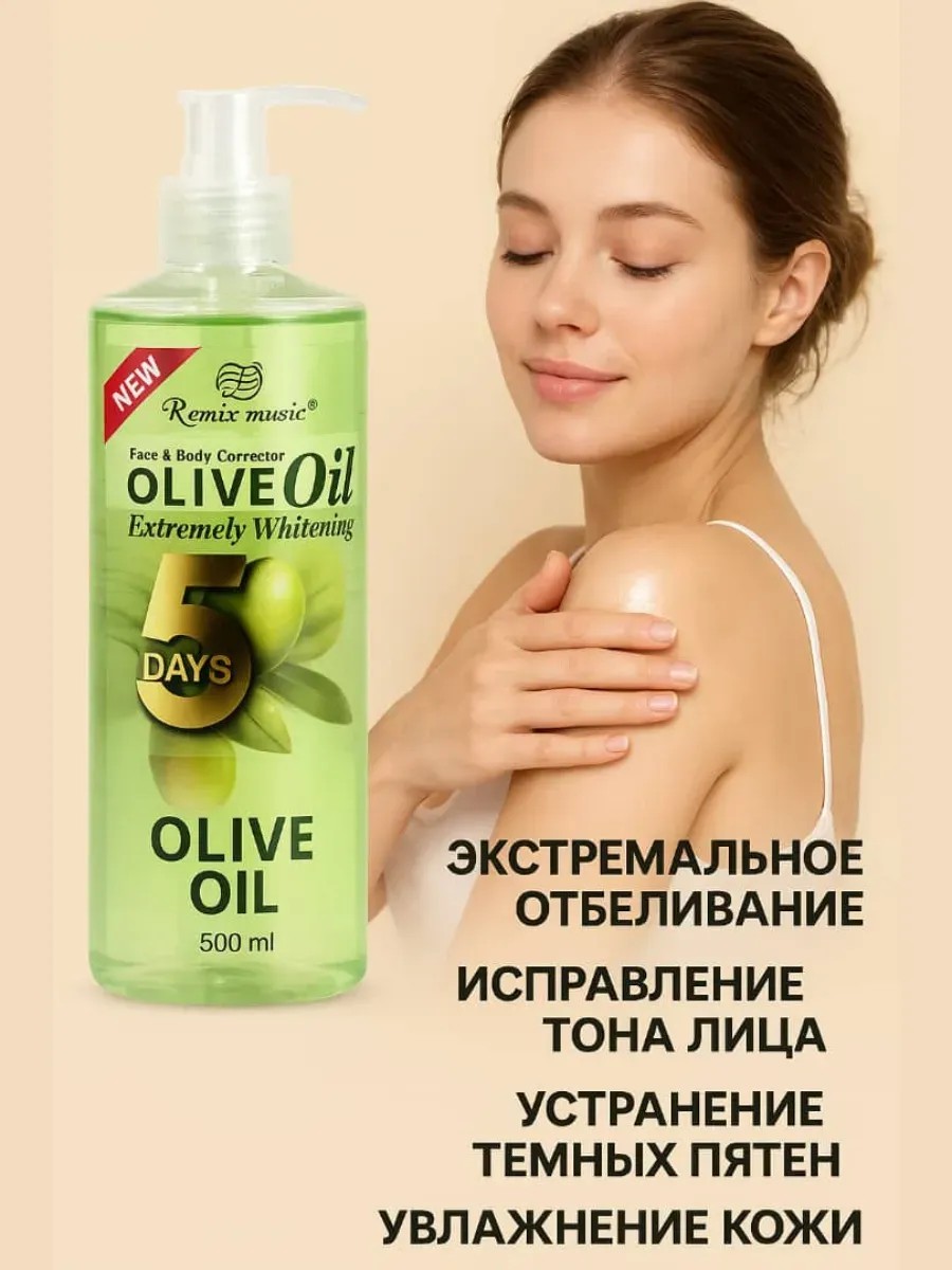 Remix Music Olive Oil Extremely Whitening Face & Body Corrector is a modern skin care product for the face and body, created for those who value naturalness, health, and beauty. This product has a pronounced complex effect: it effectively brightens, nourishes, and restores the skin, restoring its softness, elasticity, and radiance.