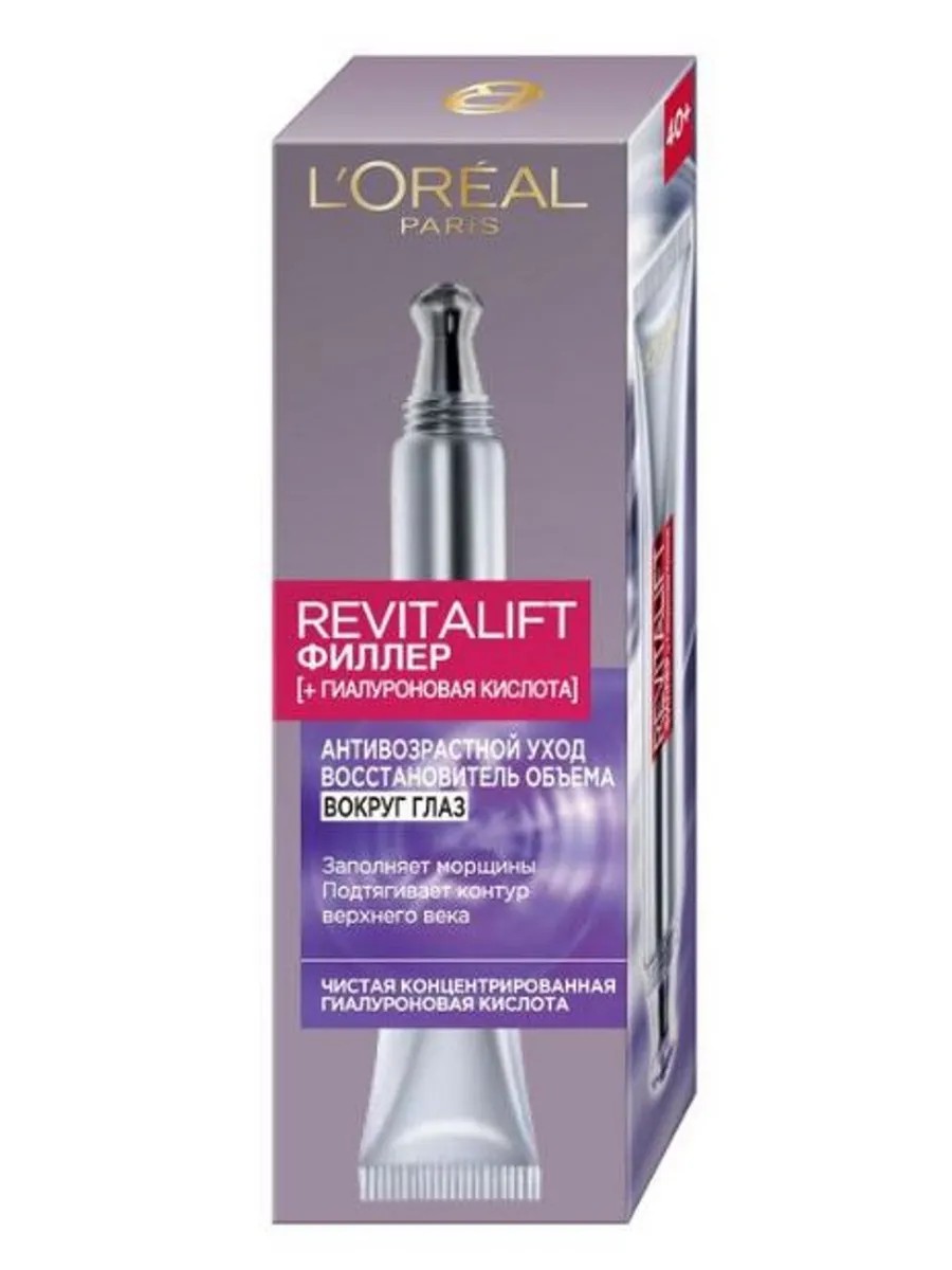 L`OREAL Ревиталифт филлер вокруг глаз 15 мл. Антивозрастной крем для области вокруг глаз Revitalift Филлер оказывает выраженное воздействие на нежную тонкую кожу в этой зоне. Его инновационная формула обогащена чистой концентрированной гиалуроновой кислотой, удерживающей драгоценную влагу в коже и стимулирующей регенерацию на клеточном уровне. Преимущества: заполняет морщины и впадины: благодаря гиалуроновой кислоте высокой концентрации, проникающей в ткани кожи, формула ухода эффективно заполняет морщины изнутри, сокращает мешки и выравнивает рельеф слезных впадин (носослезных борозд). Подтягивает контур верхнего века: укрепляет кожу верхнего века и словно подтягивает ее. Взгляд становится более распахнутым! Кожа вокруг глаз обновляется день за днем. Применение: утром и вечером при помощи изогнутого дозатора наносите уход на кожу вокруг глаз, затем при помощи аппликатора массирующими движениями распределяйте его по направлению от внутреннего уголка глаза к внешнему.