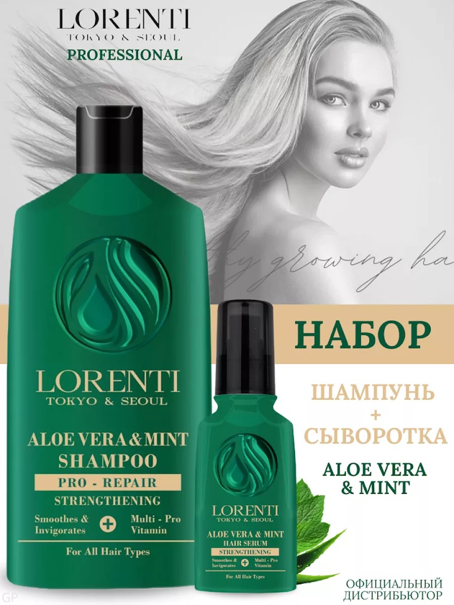 Aloe Vera and Mint Shampoo and Serum Set from the professional cosmetics brand Lorenti. Aloe Vera, known as a miracle plant, nourishes, restores, and moisturizes the scalp, strengthens hair roots, and makes hair smooth. Mint soothes irritated scalp and improves hair condition, has tonic and antibacterial properties, perfectly cleanses, refreshes, imparts a pleasant aroma to hair, nourishes, and protects from external influences.