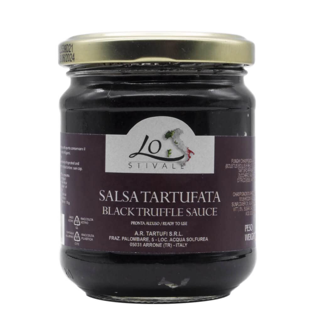 Truffled Mushroom Sauce: An exquisite sauce made with selected ingredients and a special blend of spices. Perfect for enhancing any dish. Texture: Medium-thickness. Color: Brown with darker patches. Aroma: Typical of summer truffles. Flavor: Typical of summer truffles. Nutritional values per 100g: Energy: 321 kcal. Protein: 1.8g. Carbohydrate: 7.6g. Sugars: 3.1g. Saturates: 2.3g. Fiber: 0.7g. Salt: 1.55g. Ingredients: Porcini mushrooms (Boletus edulis and related species). Black summer truffle (Tuber aestuvium vitt.) 5 . Mushrooms (Agaricus bisporus). Sunflower seed oil. Sugar. Pepper. Salt. Acidity regulator (citric acid). Flavored. No artificial colors or preservatives. 180g glass jar. Ready to use straight from the jar.