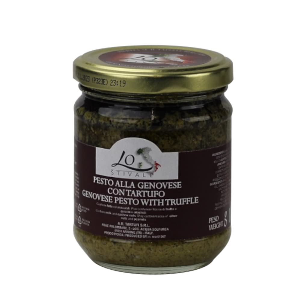 Pesto with Genoese and Truffle – Classic pesto with rich Genoese sponge cake and summer black truffle. A combination with a rich, enveloping flavor. Italian artisanal product, free from artificial colors and preservatives. Ingredients: Basil 41 , sunflower seed oil, cheeses (cow's milk, sheep's milk), salt, cashew nuts, salt, potatoes, pinols 2.2 , extra virgin olive oil, sugar, acidity regulator E575, summer truffle 1 , dried parsley, flavoring, garlic. - Packaged in a 180g glass jar. - Texture: Smooth - Color: Green - Aroma: Typical of truffle and basil - Flavor: Typical of truffle and basil - Average nutritional values per 100g of product: Energy 381 kcal - Protein 4.6g - Carbohydrate 4.7g - Sugars 2g - Fat 37.5g - Saturates 4.5g - Fiber 3g - Salt 2.5g - Ready to use straight from the jar - Ideal for topping all types of pasta, omelettes, pizzas, bruschettas, i Crostini – LoBottine Luxury FoodTARTUFO EN PESTO Gênoise dans un pot en verre 180G LOSTIVAL LUXURY FOODDESCRIPTION DU PRODUIT Peto à la génoise au tartufe – Lassique pesto à la génoise aricchito avec truffe noire estivale. Une combinaison au goût enveloppant. Produit artisanal italien sans colorants ni conservateurs. Ingrédients : basilic 41 , huile de graines de tournesol, fromages (lait de vache, lait de mouton, sel, noix de cajou, sel, pommes de terre, pinols 2,2 , huile extra vierge - sucre, correcteur d'acidité E575, truffe d'été 1 , persil déshydraté. Arôme, - ail. - Emballage dans un pot en verre 180 g. - Texture : onctueuse - Couleur : vert - Odeur : typique de la truffe et du basilic - Saveur : typique de la truffe et du basilic - Valeurs nutritionnelles moyennes pour 100 g de produit. Valeur nergétique 381 Kcal - Protéines 4,6 g - Glucides 4,7 g - Sucres 2 g - Graisses 37,5 g - Acides gras saturés 4,5 g - Fibres alimentaires 3 g - Sel 2,5 g - Produit prêt à l'emploi directement du pot - Idéal pour garnir tout type de pâtes, les omelettes, les pizzas, les bruschettes, i Crostini – LoBottine Luxury Food