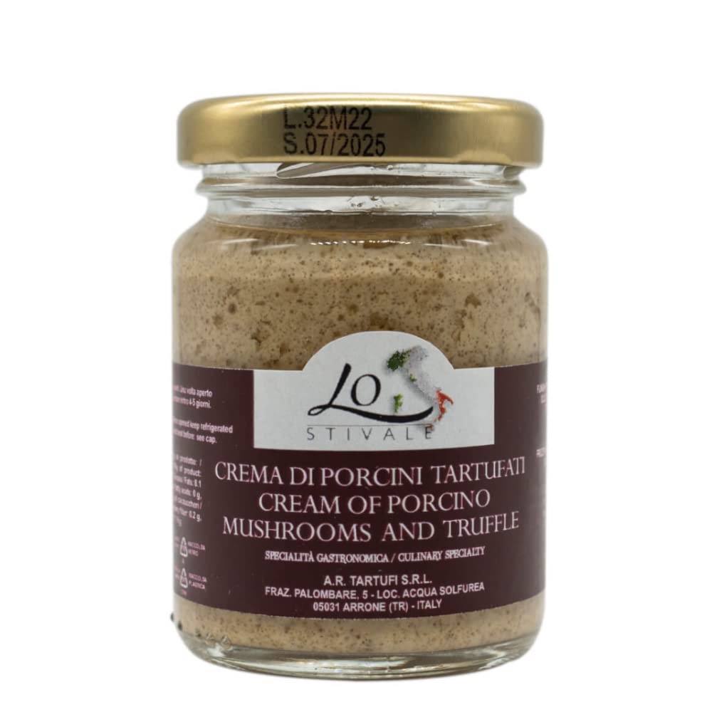 Truffled Pork Cream: LUXURY FOOD LoBottine's truffled pork cream will bring you an intense burst of flavor straight from the heart of our country! Average nutritional values per 100g of product. Energy: 180 kcal. Carbohydrate: 22.4g. Sugar: 5.7g. Fat: 8.1g. Fiber: 0.2g. Protein: 4.2g. Salt: 1.6g. Shelf life: 30 months. Store in a cool, dry place. Once opened, keep refrigerated, covered with oil, for a maximum of 4 to 5 days. Ingredients: Pork mushrooms 70 . Sunflower seed oil. White truffle 5 . Salt. Flavorings. No artificial colors or preservatives. 80g glass jar. Ready to eat straight from the jar.