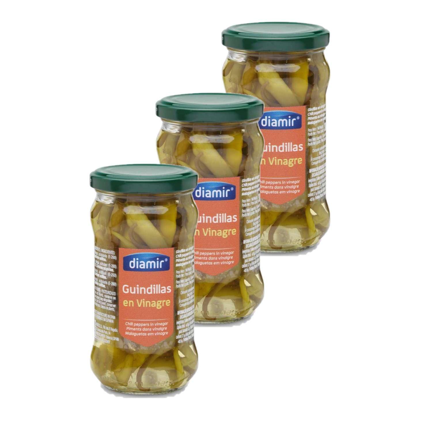 This lot contains 3 products described below: These peppers are carefully prepared to maintain their crunchy texture and tangy flavor, marinated in an aromatic vinegar that enhances their natural taste. Perfect as a condiment or ingredient to add a touch of spice to your favorite dishes. PNE: 100g Ingredients : Water, chili pepper, salt, vinegar, firming agent E-509, antioxidant E-300 E-223 Allergens: Sulphites Storage method: Store at room temperature, away from heat and humidity before opening. Directions for use: Add a few peppers to spice up your dishes, sauces, vinaigrettes or marinades. Also perfect for an aperitif. Product information: Net weight: 300g Origin: Spain Energy: 173KJ 41Kcal Lipids: 0.4g including saturated fatty acids 0.2g Carbohydrates: 7.1g including sugars 0.2g Protein: 1.9g Dietary fiber: g Salt: 1.9g Packaging: Glass Jar Full details available on the product packaging. The information on this page is for information purposes only. We encourage you to read the information on the product label, particularly regarding food allergies. INGREDIENTS Water, chili pepper, salt, vinegar, firming agent E-509, antioxidant E-300 E-223 SAFETY WARNING Full details available on the product packaging. The information on this page is for information purposes only. We encourage you to read the information on the product label, particularly regarding food allergies. Vegan - Cuisine: Mediterranean. Gluten-free Lactose-free No added sugar No preservatives No colorings. Ready to use. Allergen list: Sulfites. Ingredients list: Water, chili pepper, salt, vinegar, firming agent E-509, antioxidant E-300 E-223. Ce lot contient 3 produits décrits ci-dessous : Ces piments sont préparés avec soin pour maintenir leur texture croquante et leur saveur piquante, marinés dans un vinaigre aromatique qui rehausse leur goût naturel. Parfaits comme condiment ou ingrédient pour ajouter une touche de piquant à vos plats préférés. PNE : 100g Ingrédients : Eau, piment, sel, vinaigre, affermissant E-509, antioxydant E-300 E-223 Allergènes : Sulfites Mode de conservation : A conserver à température ambiante, à l'abri de la chaleur et de l'humidité avant ouverture. Conseil d'utilisation : Ajoutez quelques piments pour relever vos plats, sauces, vinaigrettes ou marinades. Parfaits aussi pour l'apéritif. Informations produit : Poids net : 300g Origine : Espagne Energie : 173KJ 41Kcal Lipides : 0,4g dont acides gras saturés 0,2g Glucides : 7,1g dont sucres 0,2g Protéines : 1,9g Fibres alimentaires : g Sel : 1,9g Emballage : Bocal en Verre Détail complet et disponible sur l'emballage du produit. Les informations présentes sur cette page sont à titre indicatif. Nous vous invitons à prendre connaissance des informations sur l'étiquette du produit, en particulier concernant les allergies alimentaires. INGRÉDIENTS Eau, piment, sel, vinaigre, affermissant E-509, antioxydant E-300 E-223 AVERTISSEMENT DE SÛRETÉ Détail complet et disponible sur l'emballage du produit. Les informations présentes sur cette page sont à titre indicatif. Nous vous invitons à prendre connaissance des informations sur l'étiquette du produit, en particulier concernant les allergies alimentaires. Végan - Type de cuisine : Méditerranéenne. Sans gluten Sans lactose Sans sucre ajouté Sans conservateur Sans colorant. Prêt à l'emploi. Liste des allergènes : Sulfites. Liste des ingrédients : Eau, piment, sel, vinaigre, affermissant E-509, antioxydant E-300 E-223.