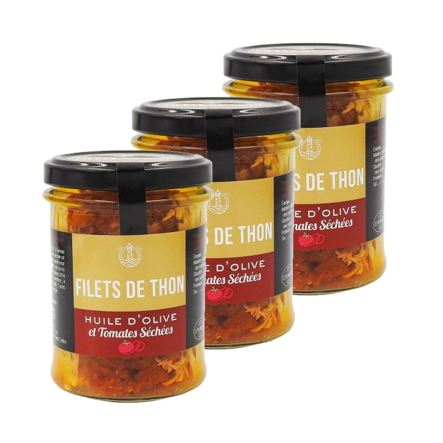 This lot contains 3 products described below: The French love tuna: it is rich in omega-3 and protein, and fits perfectly into a healthy diet. Tuna with olive oil and dried tomatoes offers a delicious taste for all your recipe ideas. As a starter, it comes in rillettes, salad or verrines. It can also be cooked in omelettes, gratins, fritters, fish bread, pasta or savory tarts: anything is possible! PNE: 130g Ingredients : Albacore TUNA 50 , olive oil 34 , dried tomato pieces 15 , salt. Allergens: Fish Storage method: Store at room temperature, away from heat and humidity before opening. Directions for use: Drain the product well before tasting. Product information: Net weight: 200g Origin: Spain Energy: 872KJ 208Kcal Lipids: 10g including 2.5g saturated fatty acids Carbohydrates: 0g including sugars 0g Protein: 29g Dietary fiber: NCg Salt: 0.77g Packaging: Glass Jar Full details available on the product packaging. The information on this page is for information purposes only. We encourage you to read the information on the product label, particularly regarding food allergies. INGREDIENTS Albacore TUNA 50 , olive oil 34 , dried tomato pieces 15 , salt. SAFETY WARNING Full details available on the product packaging. The information on this page is for information purposes only. We encourage you to read the information on the product label, particularly regarding food allergies. - Cuisine type: Mediterranean. Gluten-free Lactose-free No added sugar No preservatives No colorings. Rich in omega 3 and protein. Allergen list: Fish. Ingredients list: Albacore tuna 50 , olive oil 34 , dried tomato pieces 15 , salt. Ce lot contient 3 produits décrits ci-dessous : Les Français raffolent du thon : il est riche en oméga-3 et en protéines, et s'intègre parfaitement dans une alimentation saine. Le thon à l'huile d'olive et tomates séchées offre un goût savoureux pour toutes vos idées de recettes. En entrée, il se décline en rillettes, en salade ou en verrines. Il se cuisine aussi dans des omelettes, des gratins, des beignets, du pain de poisson, des pâtes ou des tartes salées : tout est possible ! PNE : 130g Ingrédients : THON Albacore 50 , huile d'olive 34 , tomate séchée en morceaux 15 , sel. Allergènes : Poisson Mode de conservation : A conserver à température ambiante, à l'abri de la chaleur et de l'humidité avant ouverture. Conseil d'utilisation : Bien égoutter le produit avant la dégustation. Informations produit : Poids net : 200g Origine : Espagne Energie : 872KJ 208Kcal Lipides : 10g dont acides gras saturés 2,5g Glucides : 0g dont sucres 0g Protéines : 29g Fibres alimentaires : NCg Sel : 0,77g Emballage : Pot en Verre Détail complet et disponible sur l'emballage du produit. Les informations présentes sur cette page sont à titre indicatif. Nous vous invitons à prendre connaissance des informations sur l'étiquette du produit, en particulier concernant les allergies alimentaires. INGRÉDIENTS THON Albacore 50 , huile d'olive 34 , tomate séchée en morceaux 15 , sel. AVERTISSEMENT DE SÛRETÉ Détail complet et disponible sur l'emballage du produit. Les informations présentes sur cette page sont à titre indicatif. Nous vous invitons à prendre connaissance des informations sur l'étiquette du produit, en particulier concernant les allergies alimentaires. - Type de cuisine : Méditerranéenne. Sans gluten Sans lactose Sans sucre ajouté Sans conservateur Sans colorant. Riche en oméga 3 et en protéine. Liste des allergènes : Poisson. Liste des ingrédients : THON Albacore 50 , huile d'olive 34 , tomate séchée en morceaux 15 , sel.