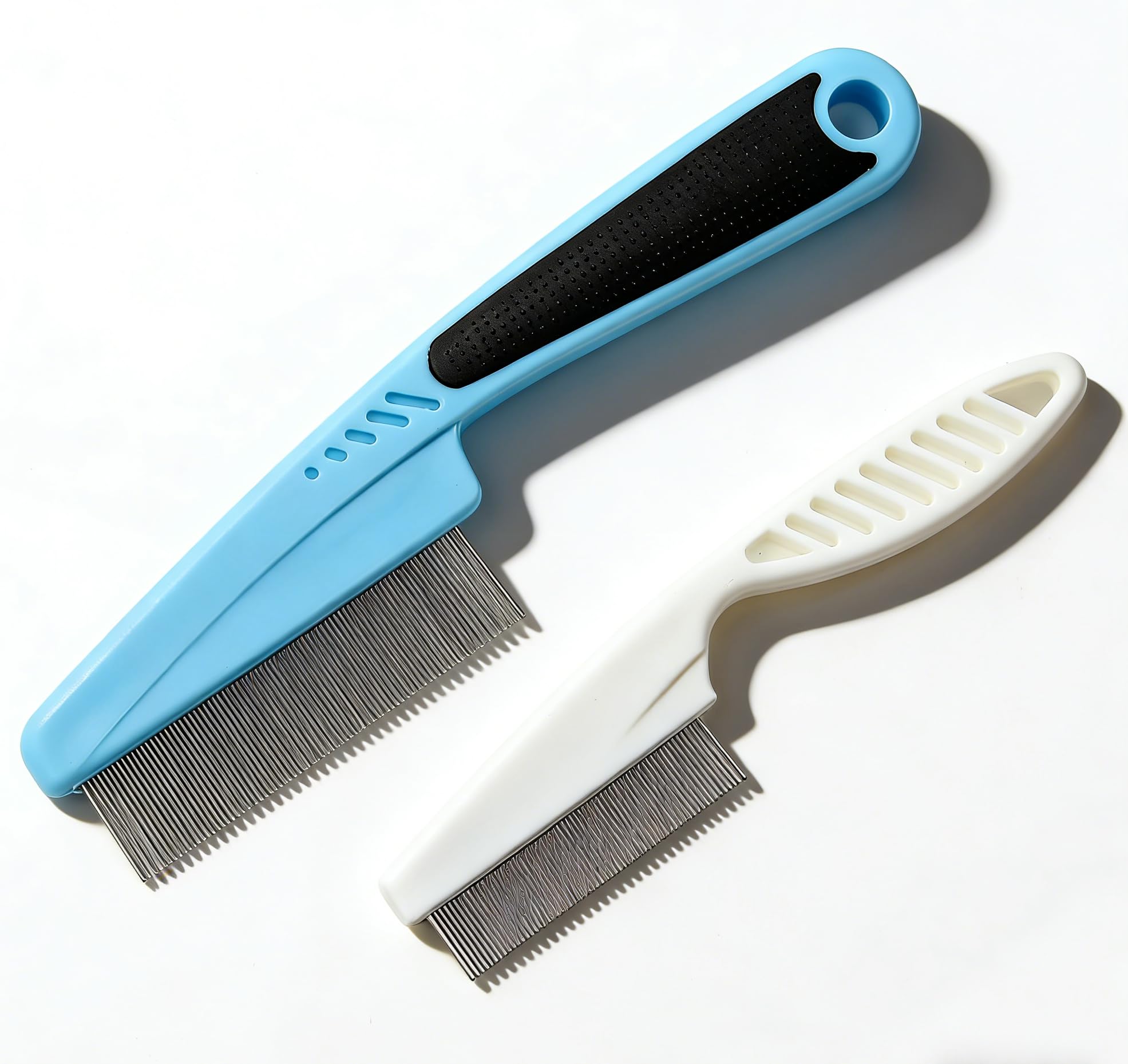 Gentle yet thorough: The smooth teeth minimize hair damage while effectively removing lice and debris – many users report a noticeable reduction after just a few sessions, combined with conditioner for best results. Durable and hygienic construction: The sturdy metal teeth resist bending and are easy to clean (rinse or boil). Pack of 2: one for home use and one for travel school kits or sharing among family members. Comfortable angled handle: Ergonomic plastic and metal handle with a non-slip design and angled shape for effortless combing, reaching all areas of the scalp without hand fatigue – perfect for parents treating children's hair. Dual wet and dry use: Works perfectly on wet (conditioned) hair for easier gliding and less pulling, or on dry hair for quick checks – ideal for thorough treatment or daily prevention during outbreaks. Effective lice and nit removal: Fine-tooth design with closely spaced metal plastic teeth captures even the smallest lice, nits, and eggs – helps control infestations quickly and safely without harsh chemicals. Suitable for children, adults, and pets. Effectively aids in lice control. Angled for easy combing. Suitable for use on children and adults. Easy-grip handle for non-slip combing. Pack of 2 (14 cm white and 18 cm blue).
