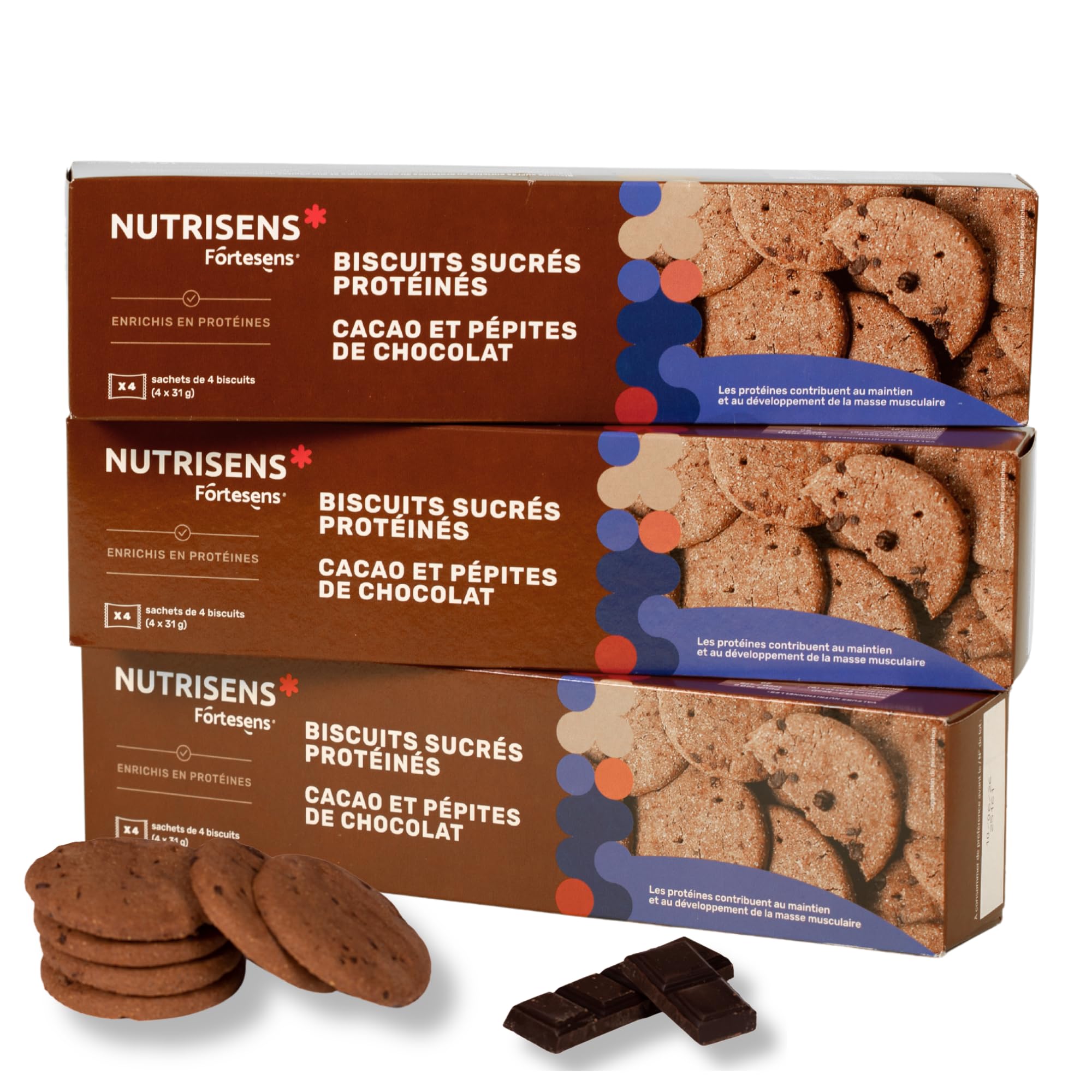 APPORT ÉNERGÉTIQUE PROTÉINES Avec 475 kcal et 16 g de protéines 100 g, ces biscuits apportent un soutien nutritionnel idéal pour compléter les apports en énergie et en protéines chez les actifs et chez les seniors, au fil de la journée. Ils ne sont pas conçus comme un produit "minceur", mais comme une collation équilibrée : l'énergie apportée aide le corps à utiliser efficacement les protéines, notamment pour soutenir la masse musculaire.?. FORMAT PRATIQUE EN SACHETS INDIVIDUELS 1 étui contient 4 sachets de 4 biscuits (125 g). Le lot comprend 3 étuis, idéal pour emporter facilement vos biscuits partout et gérer vos prises au quotidien.?. SAVEUR CACAO PÉPITES DE CHOCOLAT Une pause gourmande au goût intense de cacao, avec 11,5 de pépites de chocolat noir, pour allier plaisir et apport nutritionnel au quotidien. ?. IDÉAL EN COLLATION, DESSERT OU PETIT-DÉJEUNER Pensés pour compléter les apports au quotidien, ils se dégustent facilement au petit-déjeuner, en dessert ou en collation. Ils peuvent être consommés secs ou trempés dans une boisson pour plus de confort de dégustation.?. RICHE EN PROTÉINES et en énergie POUR SOUTENIR LA MASSE MUSCULAIRE Ces biscuits sucrés au cacao et pépites de chocolat sont enrichis en protéines, contribuant à augmenter et maintenir la masse musculaire, tout en participant au maintien d'une ossature normale.?.