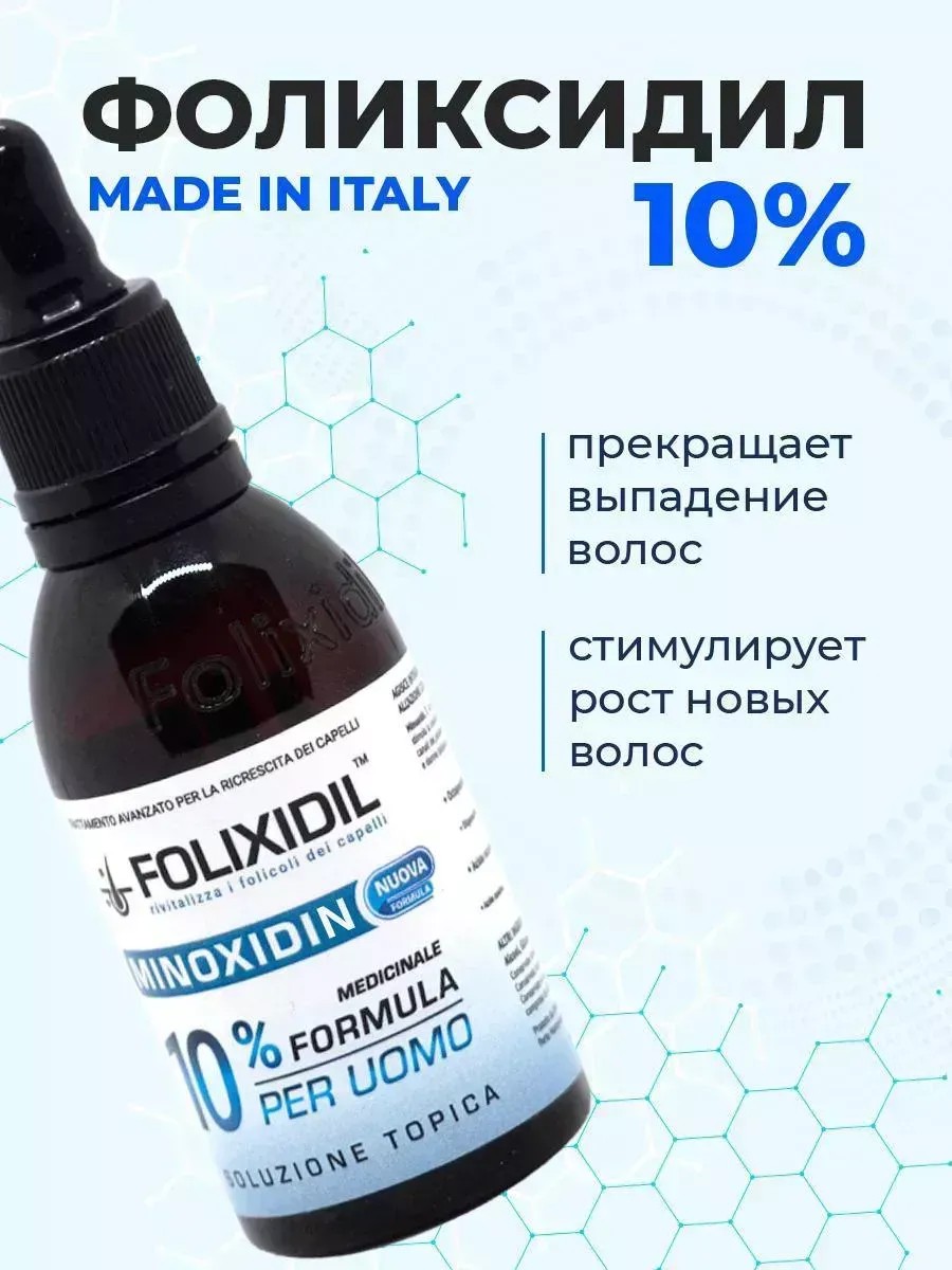 10% REINFORCED LOTION FOR BEARD AND HAIR GROWTH. One of the best products on the European market, Folixidil is a modern Italian product based on folixidil with additional ingredients. Developed to stimulate hair growth and stop baldness. Intended for external use and effective for hair loss, balding, and beard growth. The lotion stimulates hair growth by improving blood circulation in the follicles, which leads to a noticeable improvement in hair density and thickness, stimulating beard growth (beard care). The 10% concentration of the lotion accelerates hair growth and beard growth. It works better than hair growth serum, niacin, or regular 5% Kirkland. Suitable for hair loss and for the beard and moustache. The 10% lotion is a powerful product designed to combat age-related and hereditary baldness. Trichologists often prescribe supplemental treatment with medications such as nicotinic acid, copierrole, capixil, minoxidil, and mesoroller. IMPORTANT: Folixidil 10% is hormone-free and non-addictive, so its use is unlimited. Paraben-free. ANY QUESTIONS? Write to us, and we'll be happy to answer them! We are the official distributors of this product in Russia. 100% ORIGINAL. Give a useful men's gift to your husband, son, brother, father, dad, uncle, boyfriend, or man for his birthday! Not a drug!
