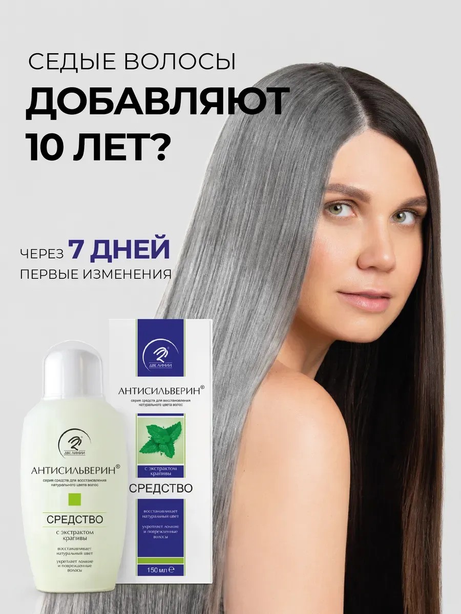 Anti-Silverin with Nettle Extract, 2 pcs. Anti-Silverin Lotion with Nettle Extract is a hair treatment that prevents graying. It works like a serum, penetrating the hair structure. Suitable for both men's and women's hair. Using this product has a beneficial effect on the hair structure, restores natural color, and eliminates the need for dyes, toners, and tinted shampoos. Unlike professional cosmetics containing harsh chemicals, acids, and oxidizing agents, Anti-Silverin does not contain dioxide. It strengthens brittle and damaged hair, reduces dandruff, protects against direct sunlight and adverse environmental factors, and adds strength. Directions for use: Shake the bottle well before each use. Pour a small amount of Anti-Silverin into your palm and apply to clean, dry hair, avoiding rubbing into the scalp. Apply generously to areas with the most gray hair. Comb thoroughly with a fine-tooth comb for even distribution and leave on for several hours (at least 8-10 hours). Blow dry if necessary. After this time, you can wash your hair with shampoo. If you are satisfied with the condition of your hair, you can leave it there. Use the product daily, as directed, until your hair regains its natural color. Then, use the product 1-2 times a week to maintain the achieved effect. To avoid staining your bed linen, it is recommended to apply the product a few hours before bedtime to allow your hair to dry completely. If staining occurs on clothing or bed linen, use soap or laundry detergent to remove any dirt. Precautions: Do not use on beards, mustaches, eyebrows, or eyelashes. Individual intolerance to certain components is possible.