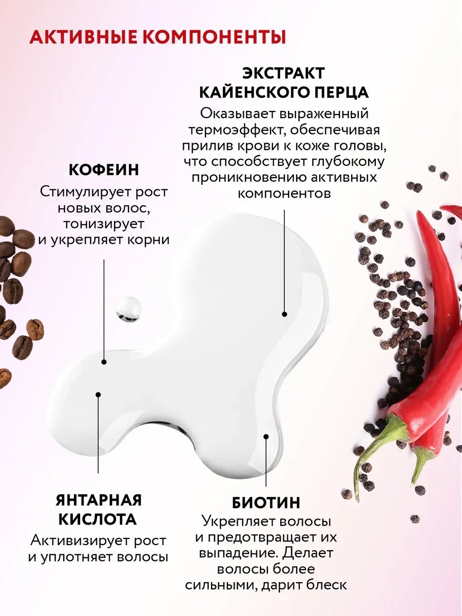 Лосьон обладает выраженным действием на корни волос. Комплекс из кофеина, ниацинамида и биотина в составе тонизирует, усиливает приток крови к волосяным фолликулам, помогая укрепить корни, остановить выпадение и ускорить рост волос. Янтарная кислота активирует рост волос, улучшает обменные процессы в коже головы, уплотняет волосы и улучшает их внешний вид. Экстракт кайенского перца оказывает термоэффект, благодаря которому усиливается питание корней. Д-пантенол смягчает и увлажняет волосы, придает им силу и поддерживает естественный блеск.ПРЕИМУЩЕСТВА: • Не утяжеляет волосы• Видимый результат• Комплексное действиеДЕЙСТВИЕ: • Стимулирует рост волос• Активизирует микроциркуляцию• Предотвращает выпадение• Укрепляет корни волосСпособ применения: распылите средство на сухую или влажную кожу головы, разделяя волосы на проборы. Проведите легкий массаж. Средство не загрязняет кожу головы и не требует смывания. Рекомендуется для регулярного использования.