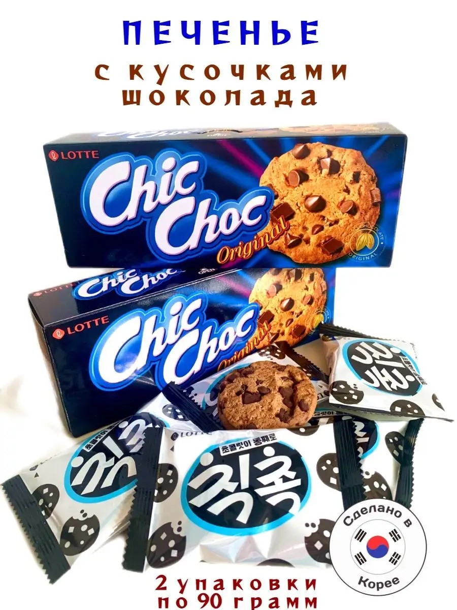 Классический десерт из Южной Кореи песочное печенье с кусочками шоколада Лотте Чик Чок - 2 упаковки. Это хрустящее рассыпчатое лакомство, как и вся продукция Lotte, отличается превосходным качеством и чудесным вкусом.