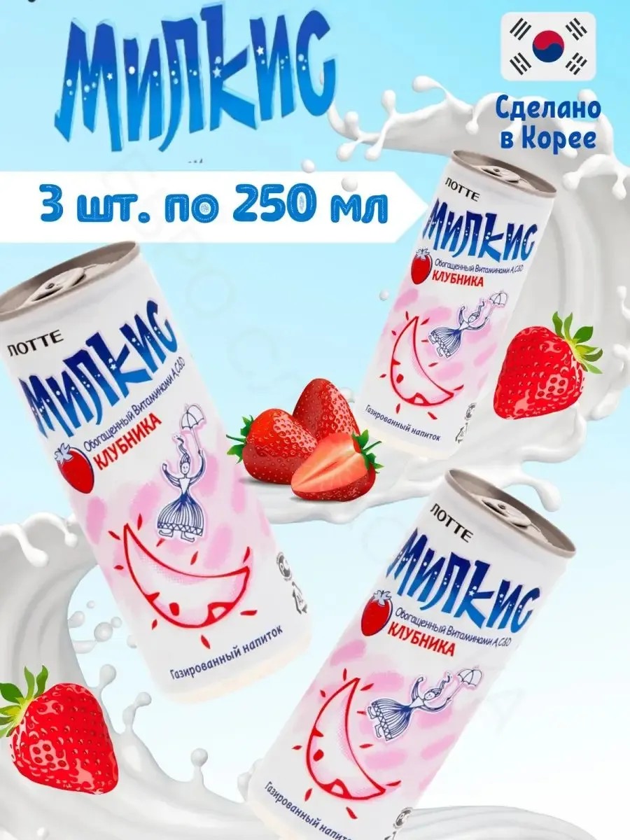Газированный напиток газировка Lotte Milkis Strawberry / Лотте Милкис Клубника 3 шт 250 мл (Корея) Безалкогольный слабогазированный напиток, обогащенный кальцием, витаминами А, С и Д, оригинальный вкус. Легкий освежающий Милкис - это сочетание мягкого нежного вкуса сливок с разнообразными вкусами фруктов, дополняемое небольшой газированностью. Милкис имеет нежный молочный цвет, в нем отсутствуют консерванты и красители. Богатый кальцием, в удобной банке, Милкис можно рекомендовать детям и пожилым людям, ведь он полезен для здоровья. Милкис напиток - полезный и вкусный выбор молодежи, в нем нет алкоголя, он прекрасно дополнит любую вечеринку.