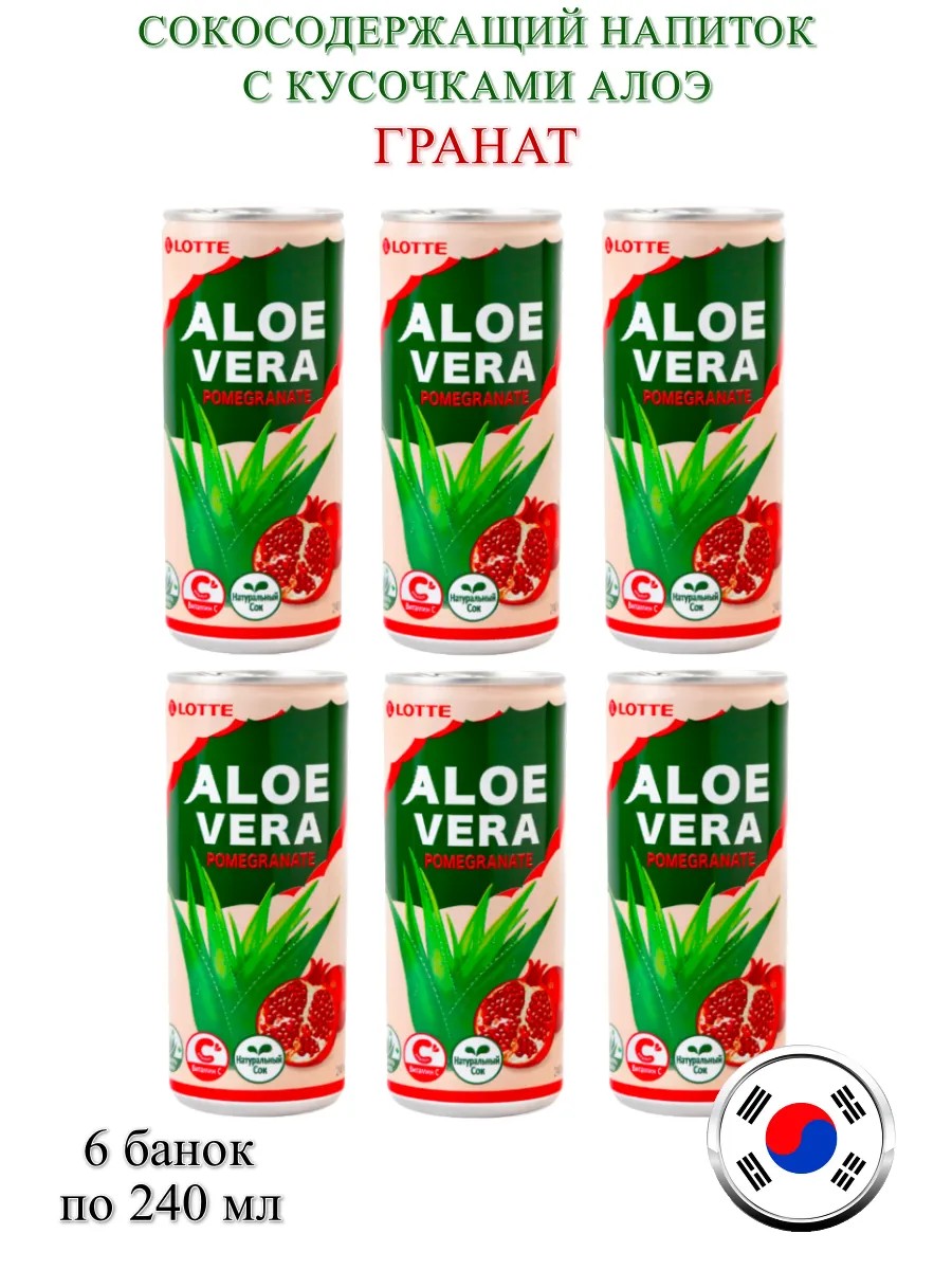 Сокосодержащий напиток Aloe Vera с кусочками алоэ со вкусом граната. Безалкогольный корейский напиток с кусочками алоэ, дополнительно обогащенный витамином С. Не содержит красителей и консервантов, является исключительно полезным для здоровья продуктом. Напиток алоэ вера от Lotte понравится взрослым и детям, утолит жажду и подарит хорошее настроение. Напиток содержит полезные вещества, витамины С и Е, антиоксиданты, а также Beta Carotene, источник витамина А. Также в состав этого напитка входят минералы магнезия, марганец, цинк, медь хром, кальций, калий и железо. Алоэ также содержит ферменты вещества, расщепляющие пищу и помогающие пищеварению. Ещё Алоэ богата салициловой кислотой, обладающей противовоспалительным действием. В Алоэ Вера содержится 19 из 20 необходимых аминокислот.