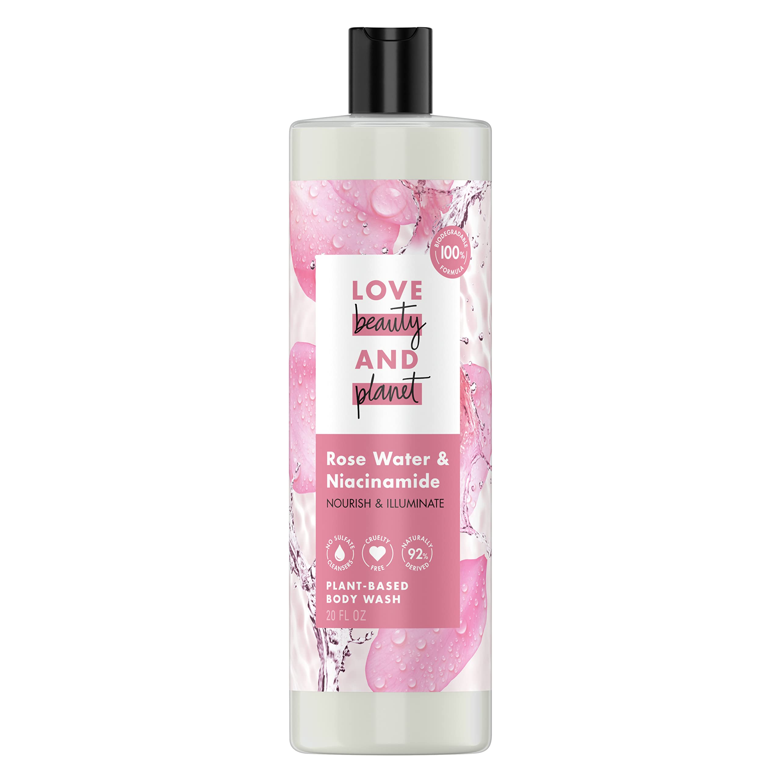 Love Beauty and Planet Plant-Based Body Wash Nourish and Illuminate Skin Rose Water and Niacinamide Made with Plant-Based Cleansers and Skin Care Ingredients 100% Biodegradable 20 fl oz Rose Water & Niacinamide 20 Ounce (P