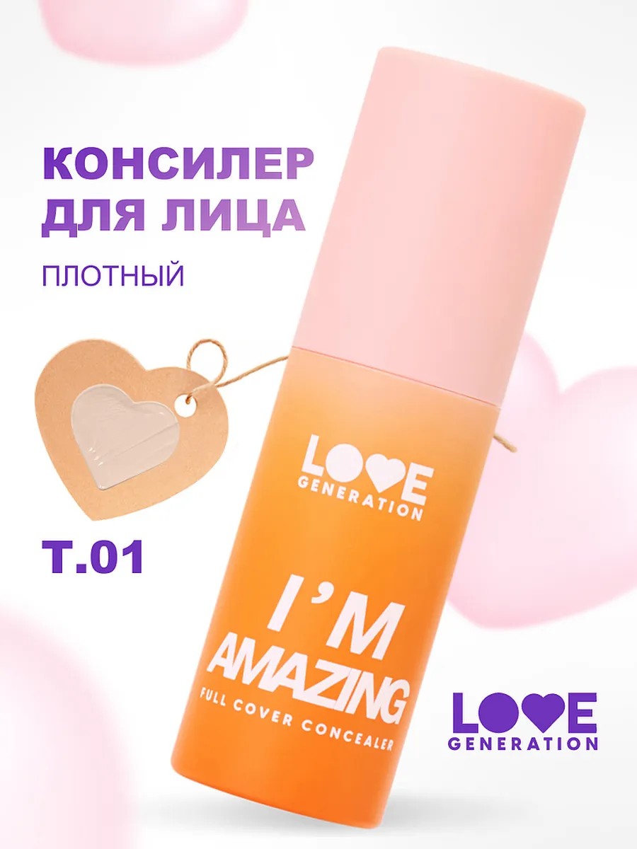 Love Generation Консилер для лица и глаз для макияжа перекрывающий I’m Amazing, тон 01 светлый бежевый — это идеальное решение для тех, кто хочет скрыть недостатки кожи и создать безупречный макияж. Этот плотный консилер обладает кремовой текстурой, которая эффективно маскирует тёмные круги под глазами, покраснения, пигментные пятна и другие несовершенства.