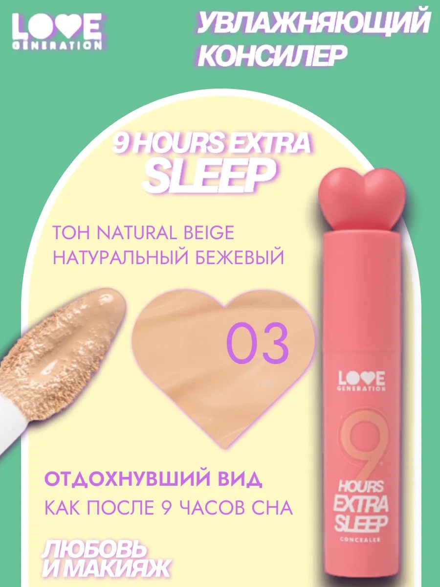 Мы понимаем, как вчера было классно и не хотелось прекращать вечеринку. Но даже если ночь была бессонной, никто об этом не узнает. Представляем идеальный увлажняющий консилер — твое секретное средство в сфере женской косметики для безупречного макияжа. Увлажняющий кремовый консилер 9 HOURS EXTRA SLEEP 03 Натуральный бежевый — это 9 часов твоего сна в милом флаконе. Он просто создан для идеального тона кожи, маскируя прыщи, синяки и круги под глазами.\nС его помощью ты легко создадашь базу под тональную основу, обеспечивая плотное покрытие и стойкость макияжа. Консилер отлично подходит для контуринга и скульптурирования лица, подчеркивая его форму и скрывая морщины.\nСветлый оттенок нашего крема корректора гармонично вписывается в любые нюансы кожи, делая визаж натуральным и свежим. Будь то повседневный или вечерний макияж, этот декоративный продукт станет незаменимым в твоей косметичке.\nКонсилер легко и равномерно наносится мягким миниатюрным аппликатором с зауженным кончиком, оформляя контур.\nВыбирай свой из четырех натуральных оттенков консилера, который подходит для всех типов кожи. \n\nПредставляем консилер, который станет незаменимым помощником в вашем арсенале косметики для макияжа. Он идеально подходит для создания безупречного тона кожи и скрытия недостатков. Этот продукт отлично справляется с пигментными пятнами и следами усталости, обеспечивая надежное покрытие.\n\nКонсилер обладает легкой текстурой, что позволяет ему легко наноситься и растушевываться. В сочетании с тональным кремом или флюидом для лица он создает идеальную базу для дальнейшего макияжа. Набор косметики для женщин включает в себя все необходимое: праймер для лица, хайлайтер, скульптор для лица и палетку для контуринга.\n\nКосметика для девочек всех возрвстов не обходит стороной этот чудесный продукт, так как он подходит для любого типа кожи. Кремовый скульптор придаст вашему лицу объем и выразительность, а сияющий хайлайтер сделает ваш макияж завершенным.\n\n