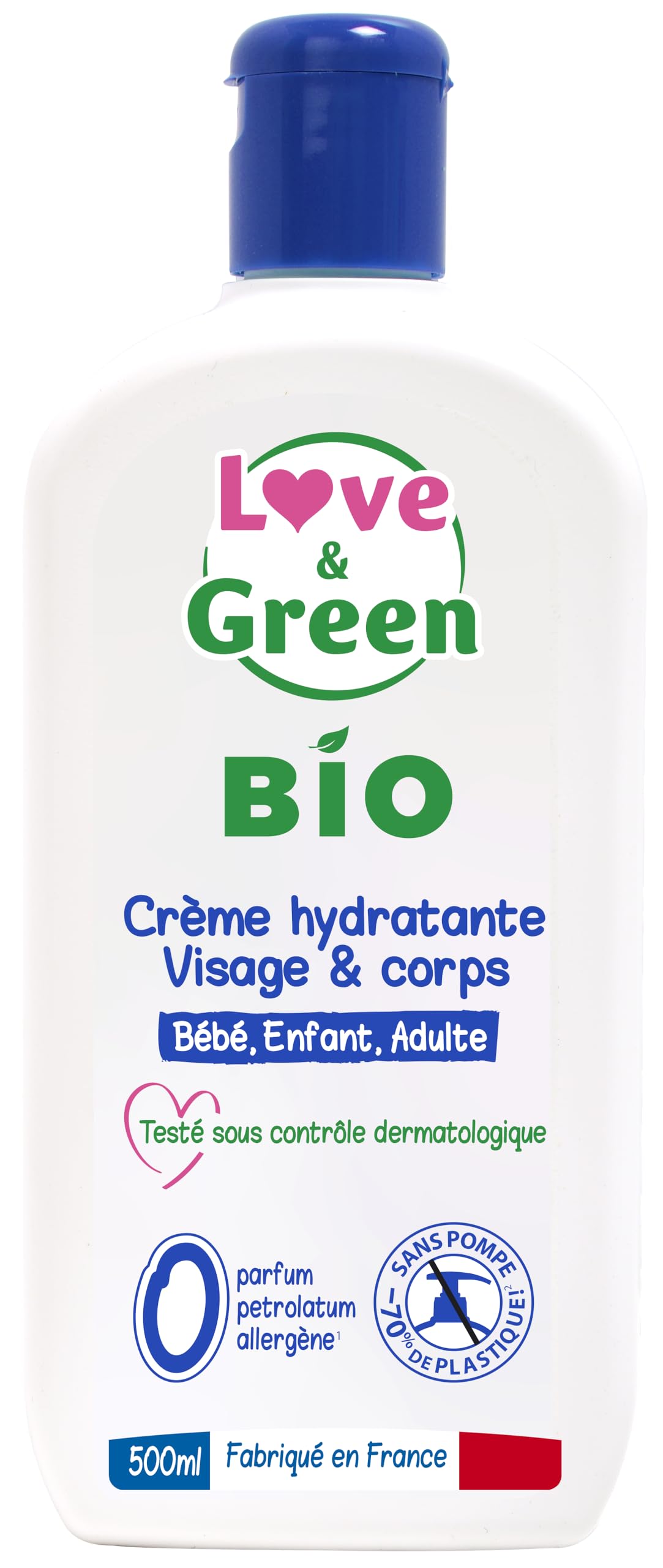 The Love Green face and body cream is organically certified by Ecocert. Enriched with natural cold cream, it deeply moisturizes and ensures longevity of baby's skin. Use after bathing or as soon as the skin is drier (for example in winter). The perfume-free formula is suitable for all skin, including sensitive and reactive. Product benefits: - 98 natural formula Made in France. - 0 perfume, petrolatum, paraffin, labelable allergens, parabens, phenoxyethanol, dyes, PEG, MITMade in France. Organic formula from Ecocert Green Life. 0 perfume, petrolatum, paraffin, labelable allergens, parabens, phenoxyethanol, dyes, PEG, MIT. Sensitive to reactive skin - 98 of natural origin. Moisturizing face and body cream without perfume to deeply hydrate baby's skin. Moisturizer that can be used after bathing or when the skin is a little drier (for example in winter).Love Green - Vochtinbrengende crème voor gezicht lichaam, 0 500 ml, gemaakt in Frankrijk De Love Green gezichts- en lichaamscrème is biologisch gecertificeerd door Ecocert. Verrijkt met natuurlijke koude crème, hydrateert het diep en zorgt voor een lange levensduur van de babyhuid. Gebruik na het baden of zodra de huid droger is (bijvoorbeeld in de winter). De parfumvrije formule is geschikt voor alle huid, ook gevoelig en reactief. Voordelen van het product: - 98 natuurlijke formule Gemaakt in Frankrijk. - 0 parfum, petrolatum, paraffine, etiketteerbare allergenen, parabenen, fenoxyethanol, kleurstoffen, PEG, MITGemaakt in Frankrijk. Biologische formule van Ecocert Green Life. 0 parfum, petrolatum, paraffine, etiketteerbare allergenen, parabenen, fenoxyethanol, kleurstoffen, PEG, MIT. Gevoelige tot reactieve huid - 98 van natuurlijke oorsprong. Hydraterende gezichts- en lichaamscrème zonder parfum om de huid van de baby diep te hydrateren Vochtinbrengende crème die kan worden gebruikt na het baden of als de huid wat droger is (bijvoorbeeld in de winter).