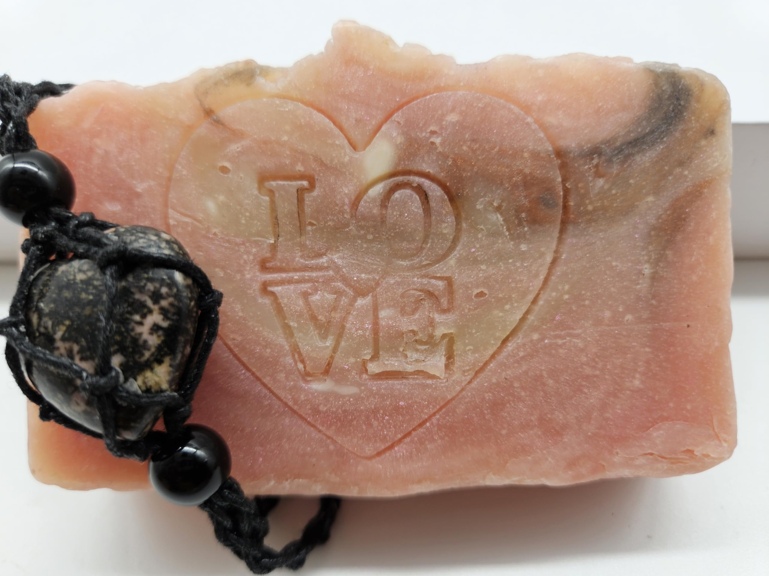 This lovely handmade soap is the perfect gift for Valentines day. Themed after a love letter it is stamped with a heart and sealed with a genuine rhodonite crystals representing love and renewal.